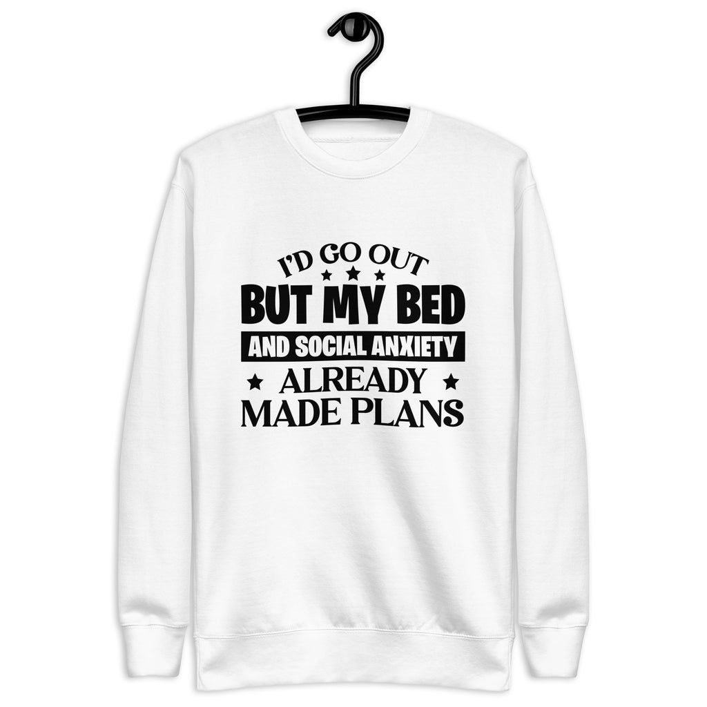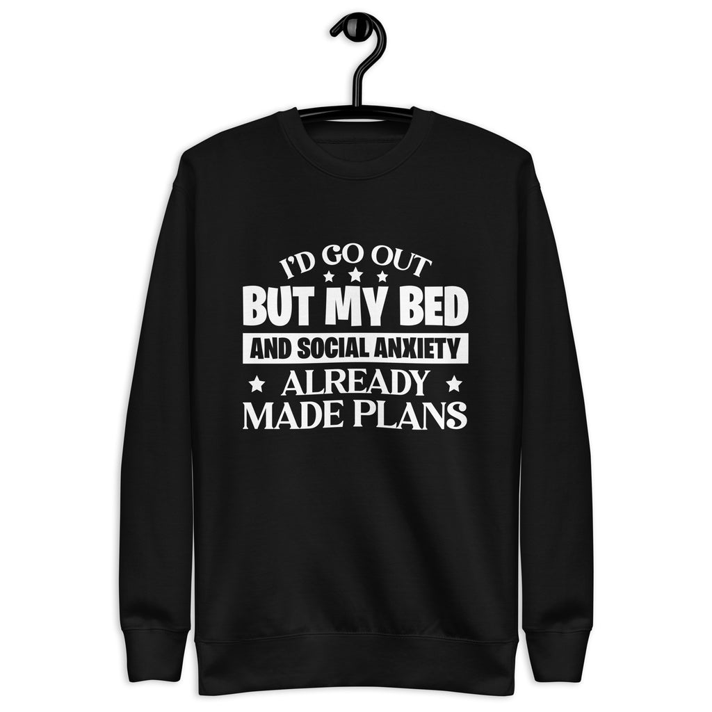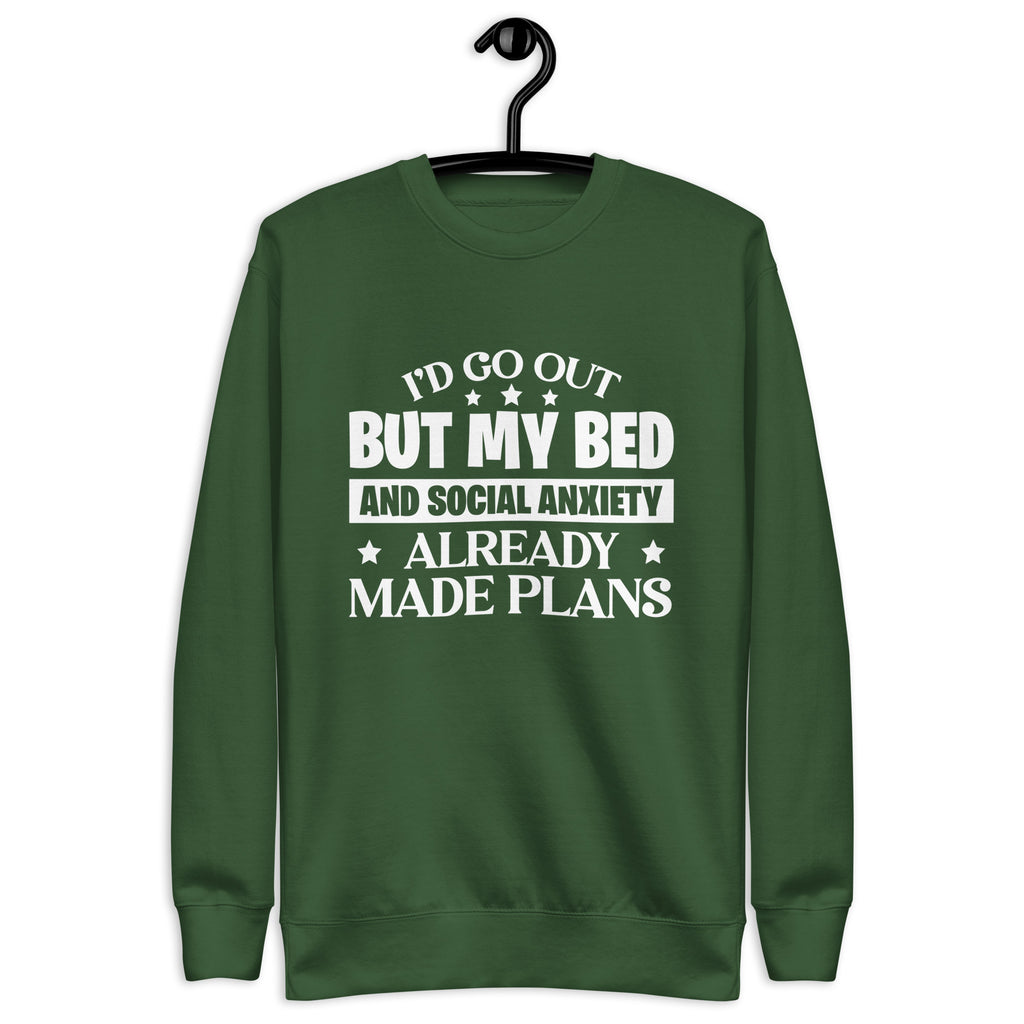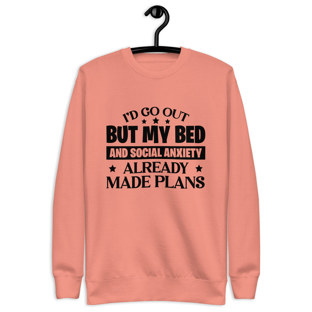 Sometimes the world wants you to go out… but your bed and your social anxiety have already scheduled a much quieter evening. This “I’d Go Out, But My Bed and Social Anxiety Already Made Plans” sweatshirt is the perfect uniform for anyone who prefers comfort over crowds.