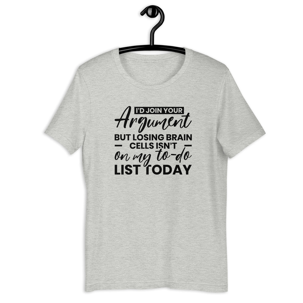 Keep it sharp with the “I’d Join Your Argument, But Losing Brain Cells Isn’t on My To-Do List Today” T-shirt. Perfect for anyone who refuses to waste time (or intelligence) on pointless debates, this tee delivers humor with a bold, relatable edge.