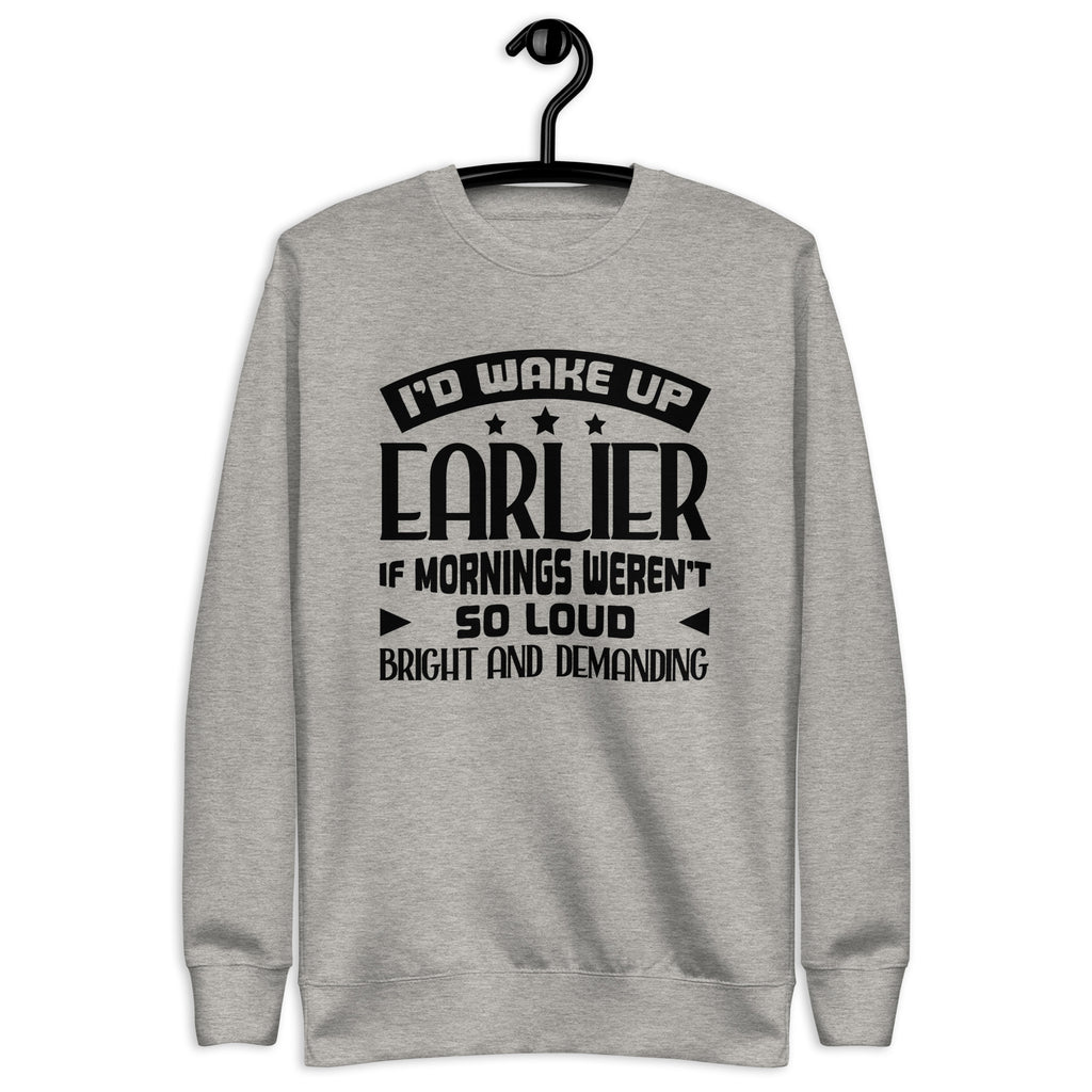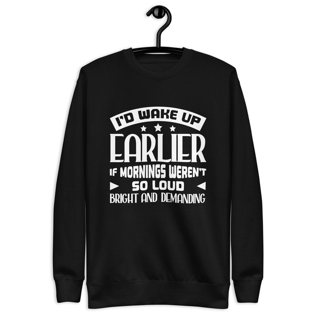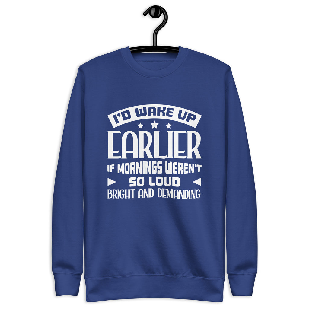 Some people love mornings… and then there’s the rest of us. This “I’d Wake Up Earlier If Mornings Weren’t So Loud, Bright, and Demanding” sweatshirt is perfect for anyone who feels personally attacked by sunshine, alarms, and responsibilities before noon.
