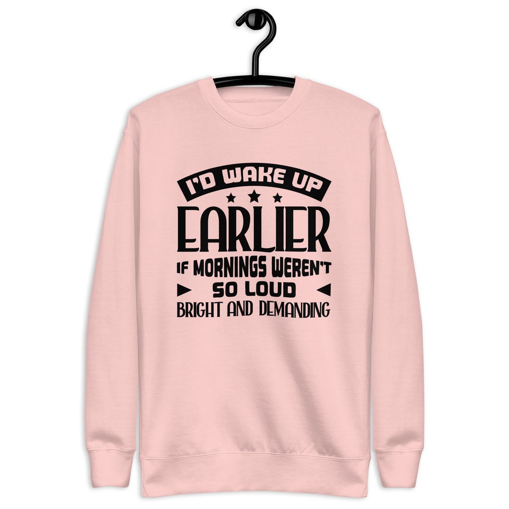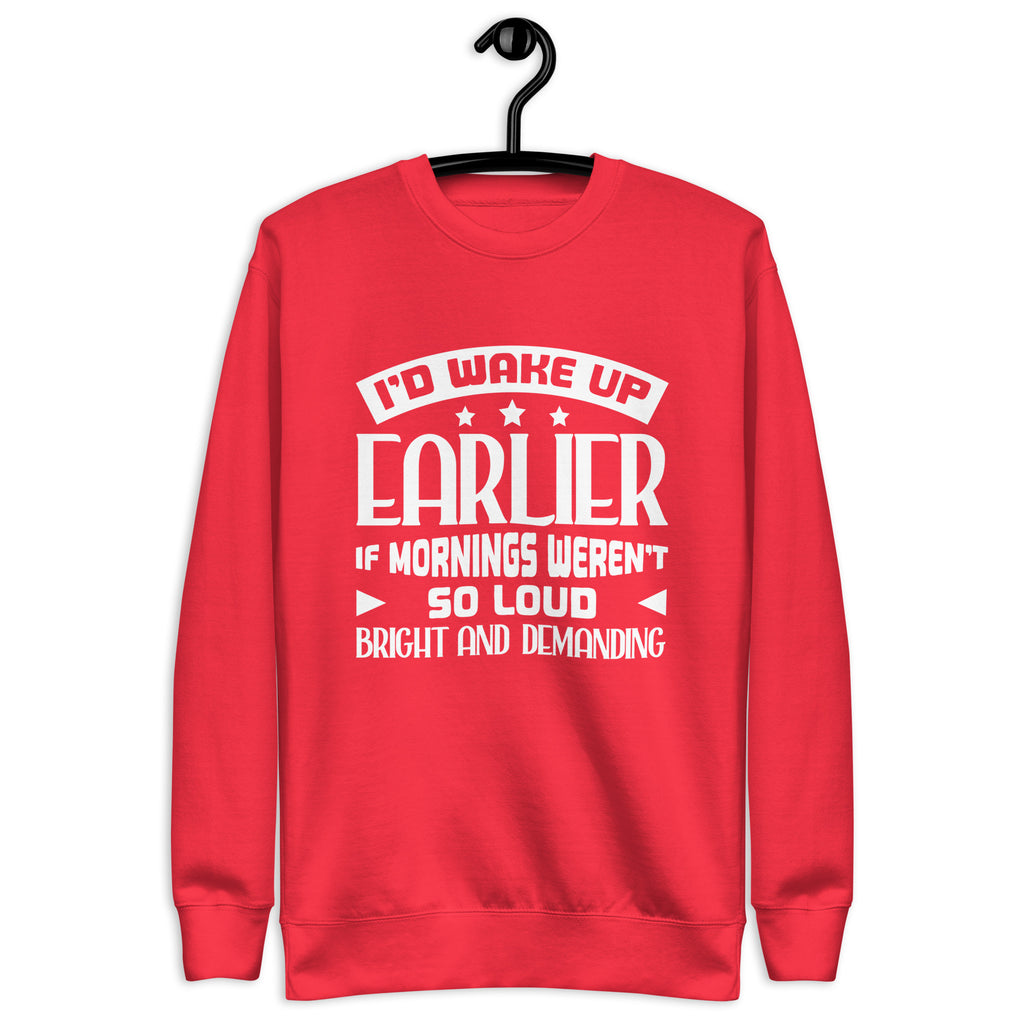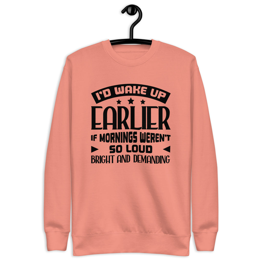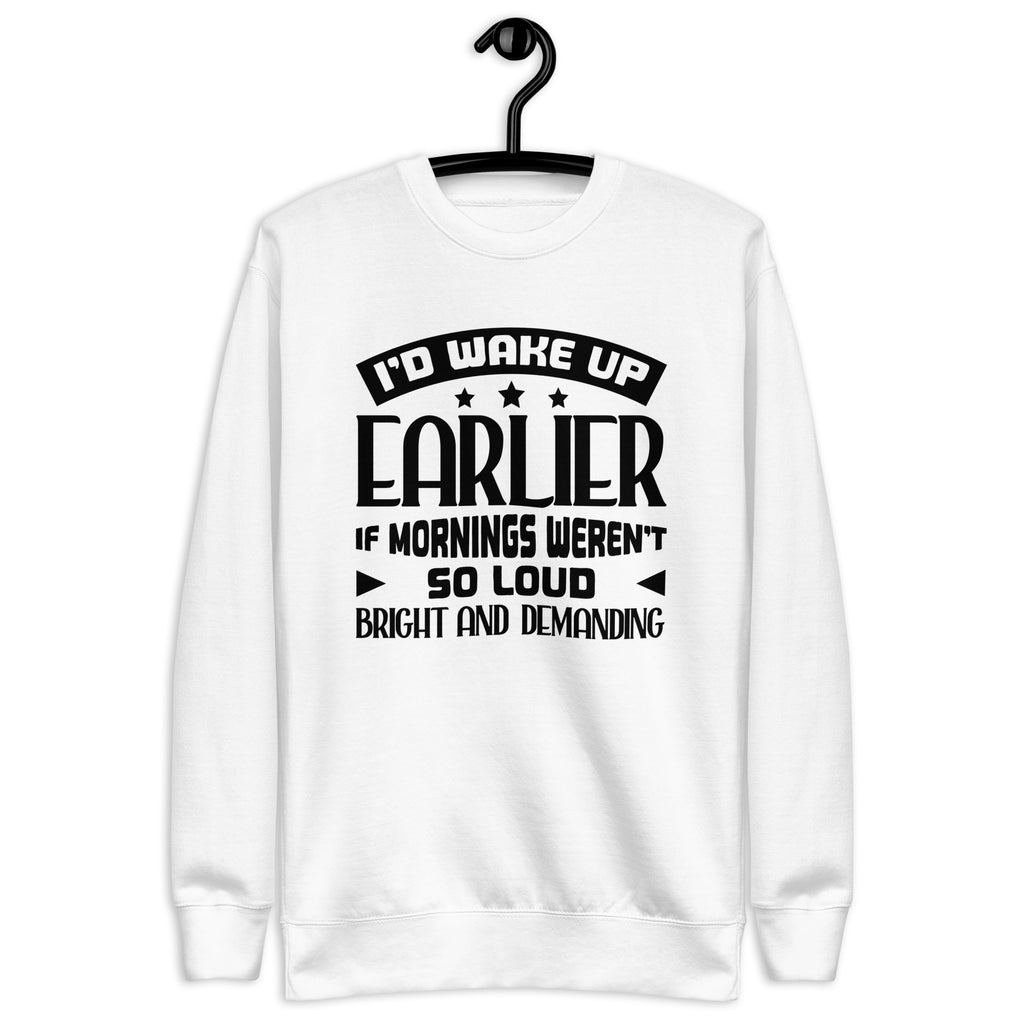 Some people love mornings… and then there’s the rest of us. This “I’d Wake Up Earlier If Mornings Weren’t So Loud, Bright, and Demanding” sweatshirt is perfect for anyone who feels personally attacked by sunshine, alarms, and responsibilities before noon.