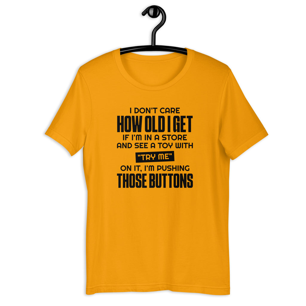 Playful, nostalgic, and full of personality—this shirt is perfect for anyone who refuses to “grow up” all the way. Featuring the witty phrase “I Don’t Care How Old I Get If I’m In A Store And I See A Toy,” it’s a hilarious nod to childhood joy that never fades (no matter how many birthdays pass).