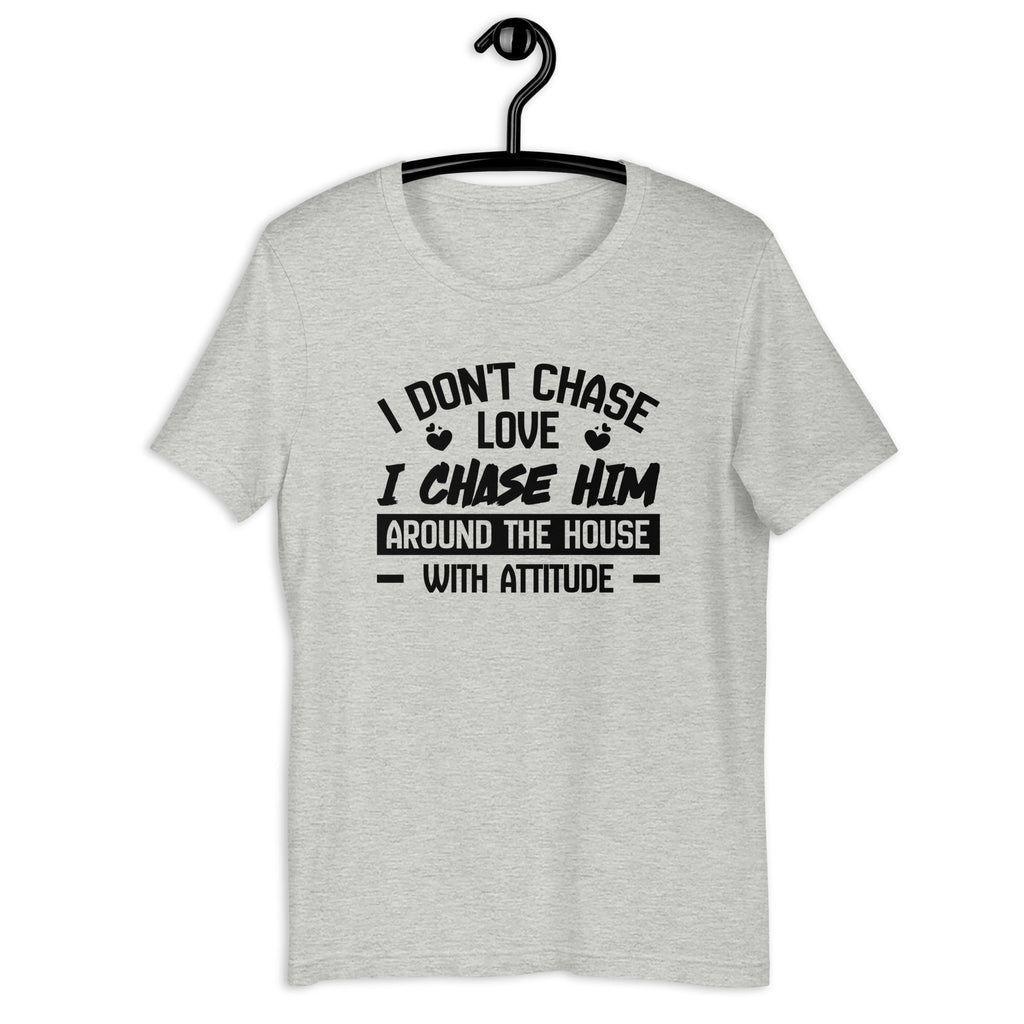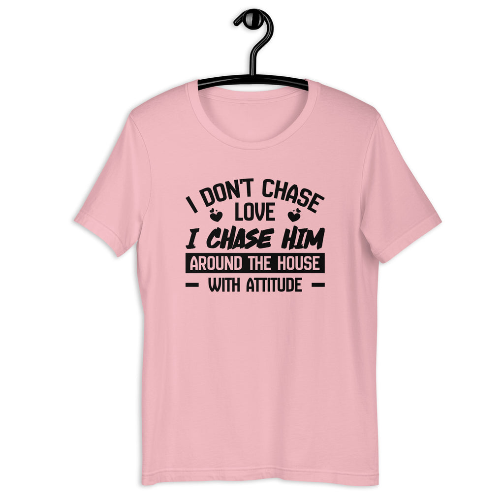 Bring the fun side of love to life with the “I Don’t Chase Love — I Chase Him Around the House (With Attitude)” T-shirt — the perfect blend of romance, sass, and real-life relationship comedy. This tee captures that hilarious truth of loving someone enough to chase them… but doing it with full dramatic flair.