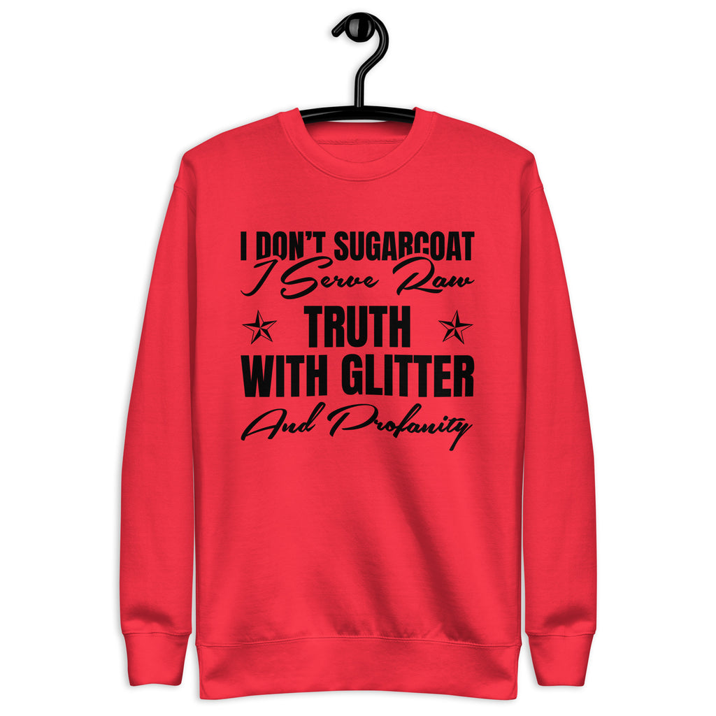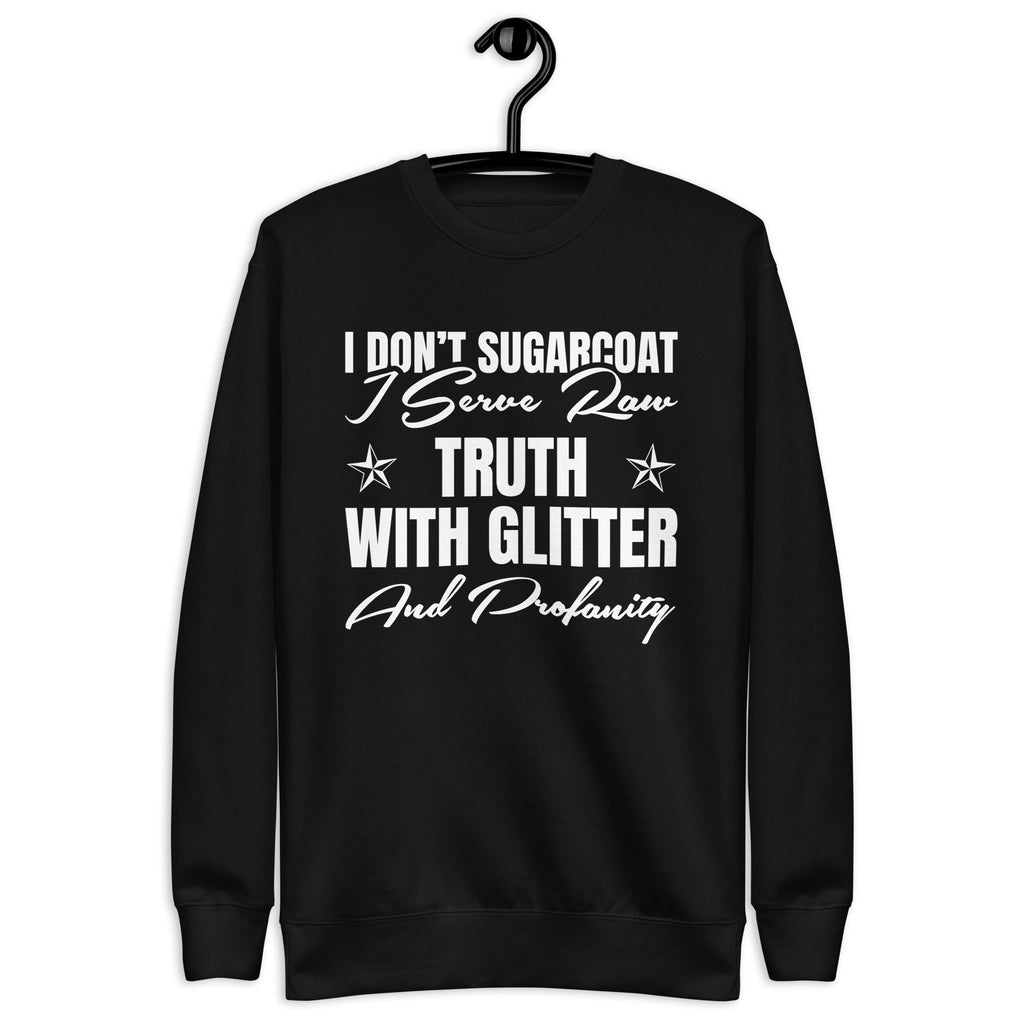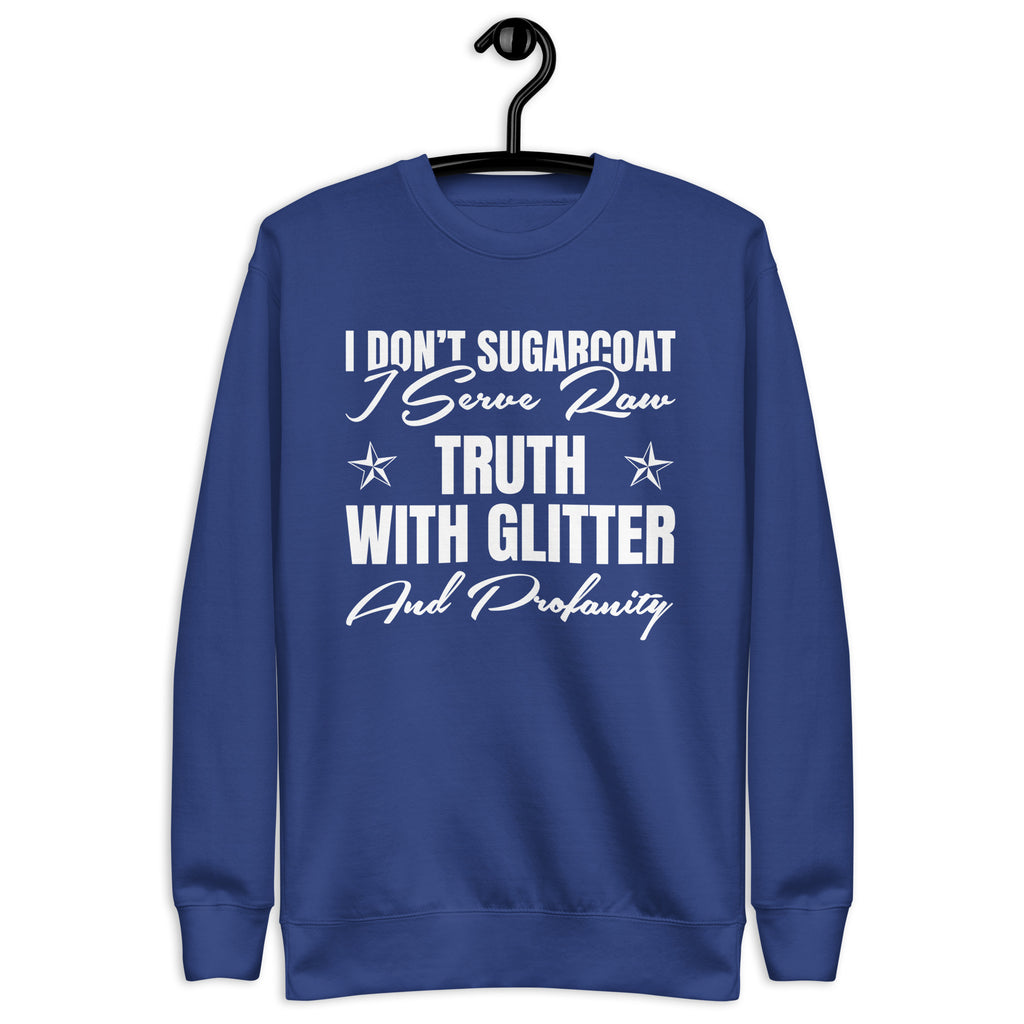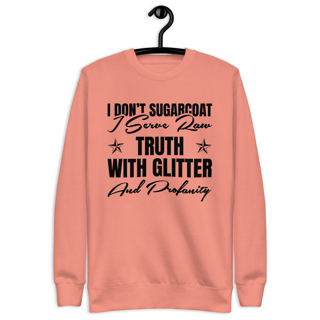 This “I Don’t Sugarcoat — I Serve Raw Truth with Glitter and Profanity” sweatshirt is for the bold, unapologetic, and fabulously honest souls who tell it like it is… and make it sparkle while doing it. Perfect for anyone whose honesty comes with flair, attitude, and just enough sass to keep things interesting.