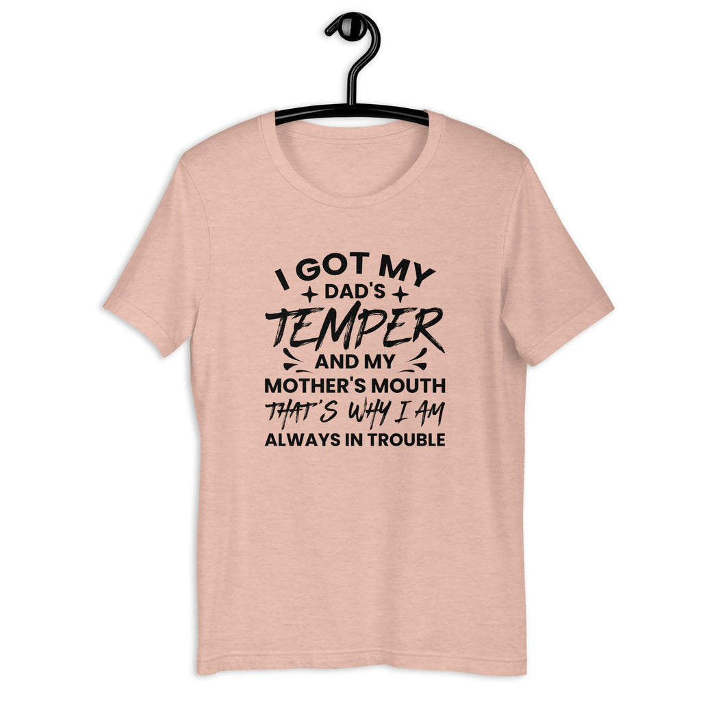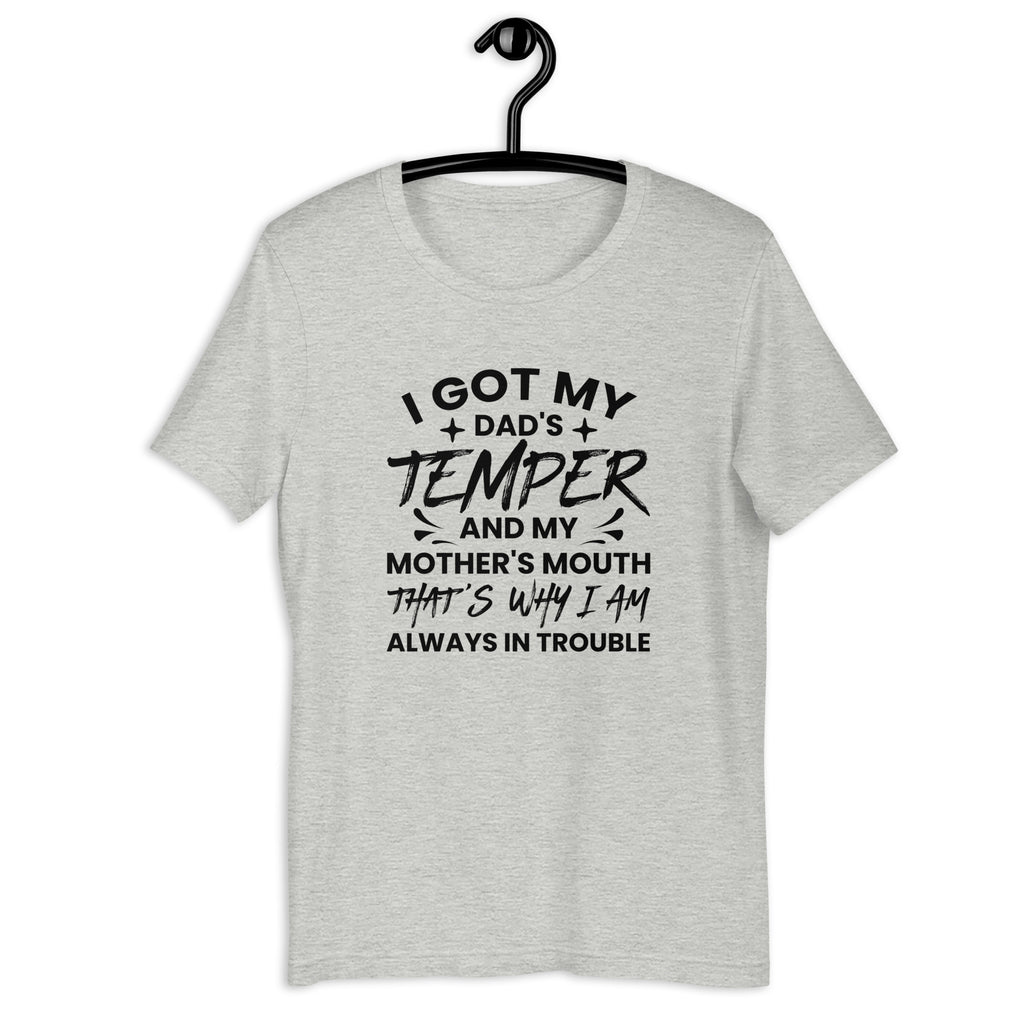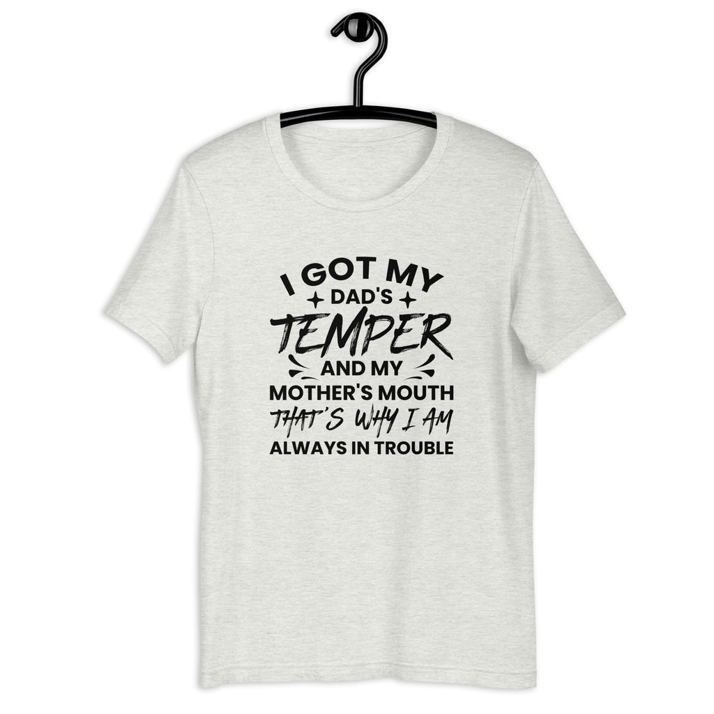 Some traits are inherited—and some get you in trouble. The “I Got My Dad’s Temper And My Mother’s Mouth, That’s Why I Am Always In Trouble” t-shirt is the perfect mix of family truth and laugh-out-loud humor.