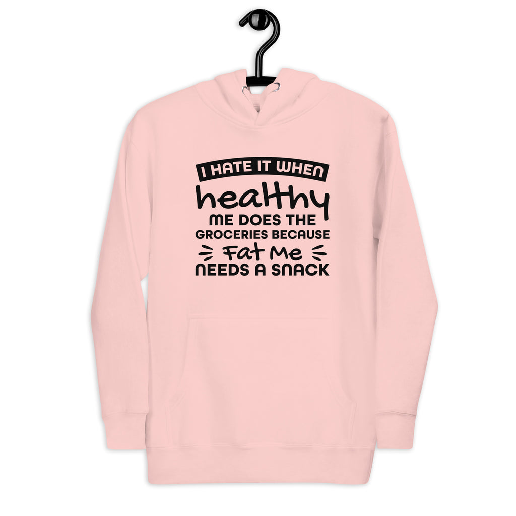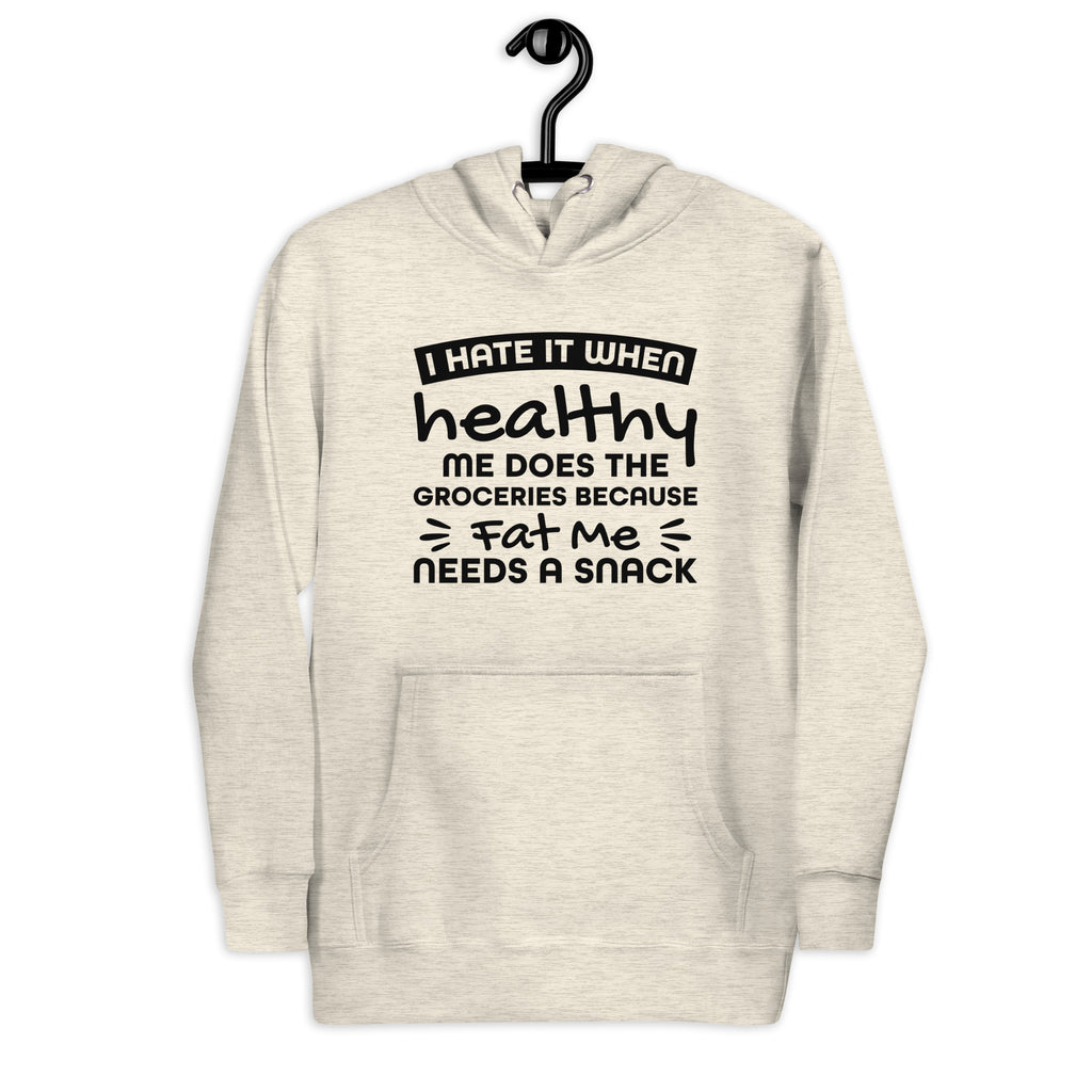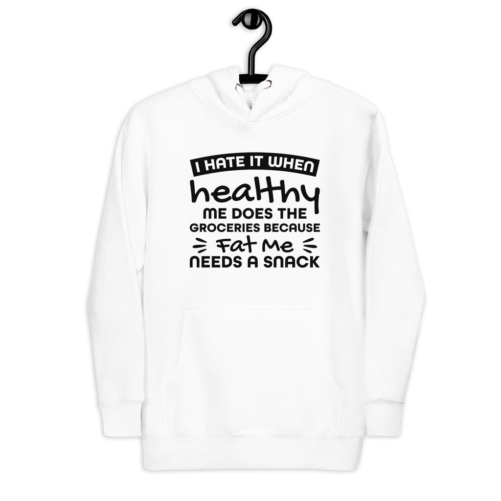 For everyone living in a constant battle between “I’m eating clean now” and “where are the snacks?” — this “I Hate It When Healthy Me Does the Groceries Because Fat Me Needs a Snack” hoodie is pure truth wrapped in cozy comfort.