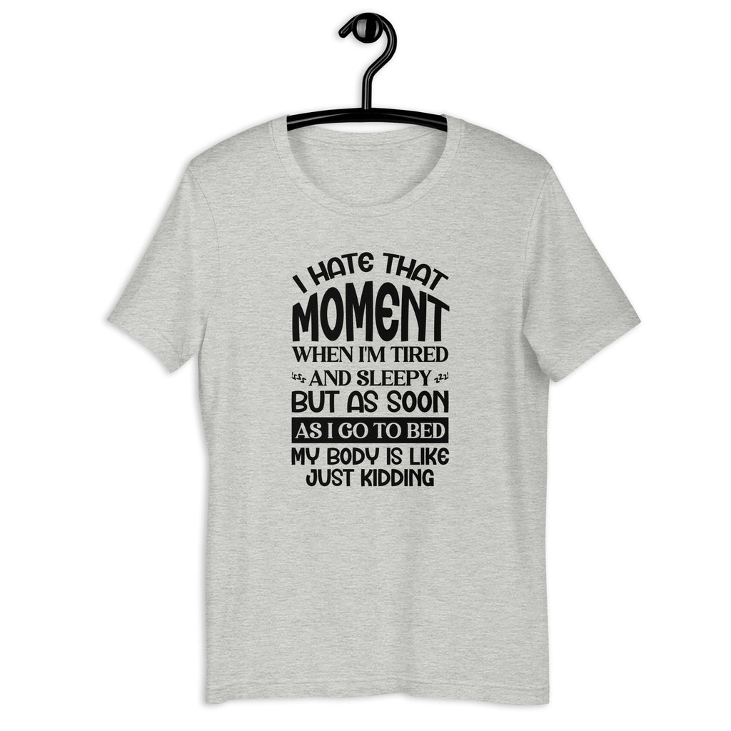 Sleep sounds great—until your body decides otherwise. The “I Hate That Moment When You’re Tired And Sleepy But As Soon As I Go To Bed My Body Is Like Just Kidding” t-shirt perfectly captures the struggle of restless nights with a dose of humor.