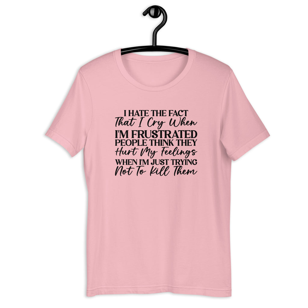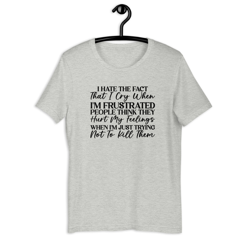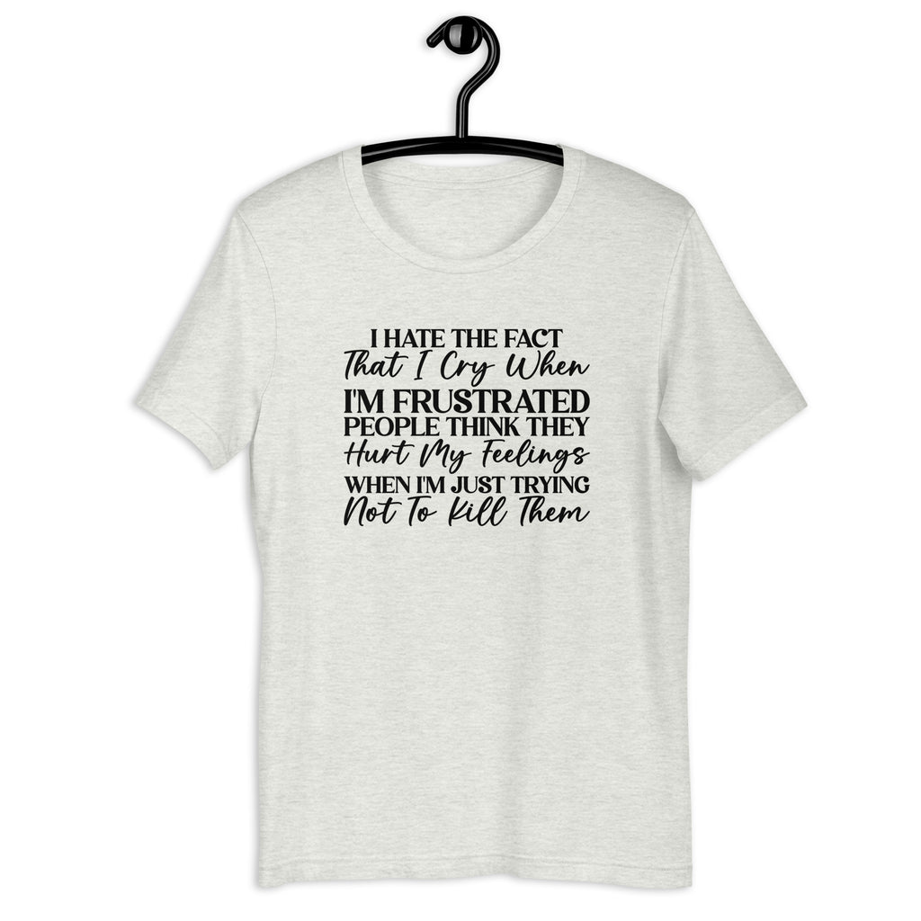 Say it like it is with this “I Hate the Fact That I Cry When I’m Frustrated. People Think They Hurt My Feelings When I’m Just Trying Not to Kill Them” t-shirt. Honest, sarcastic, and hilariously dark, this tee is perfect for anyone who feels emotions and murderous thoughts can sometimes go hand in hand.