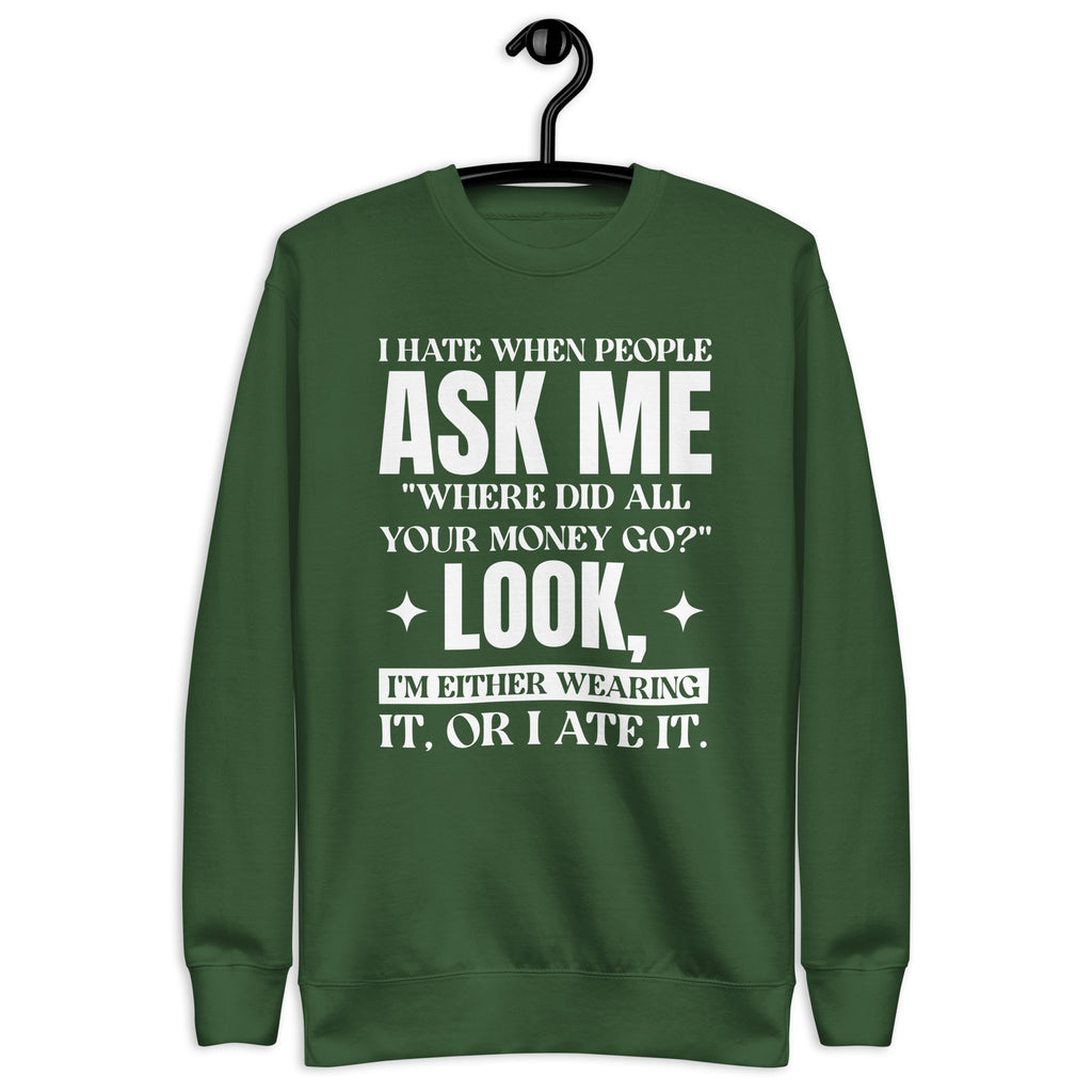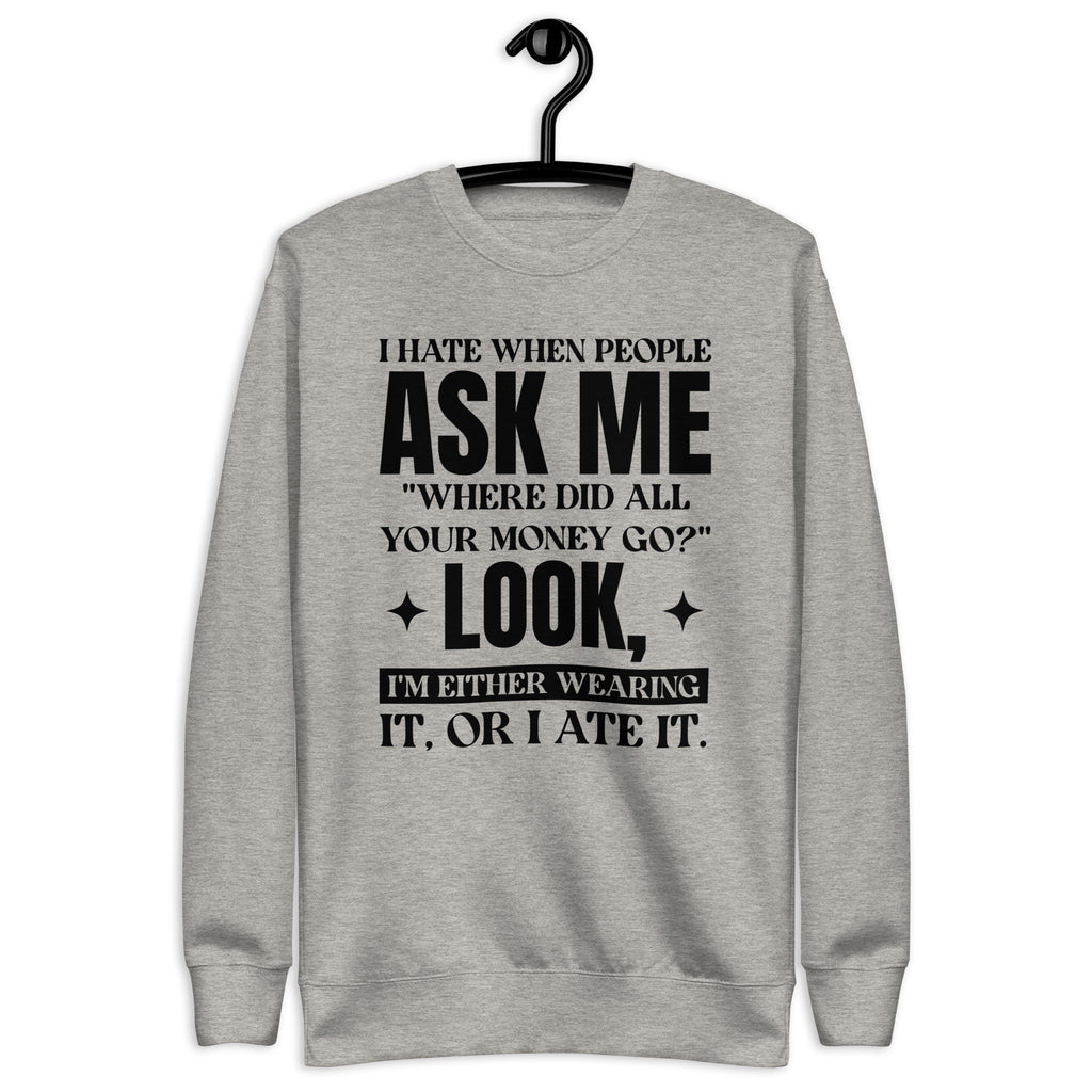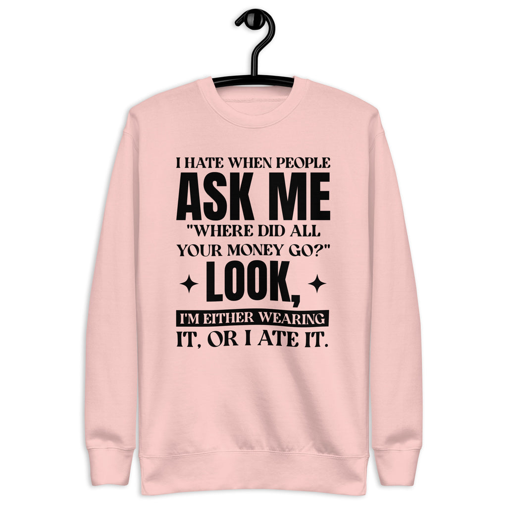 Let your wardrobe and appetite speak for themselves with this “I hate when people ask me ‘Where did all your money go?’ Look, I’m either wearing it or I ate it” sweatshirt! Perfect for fashion lovers, food enthusiasts, and anyone who proudly invests in carbs and cute clothes, this cozy piece delivers humor, honesty, and comfort all in one.