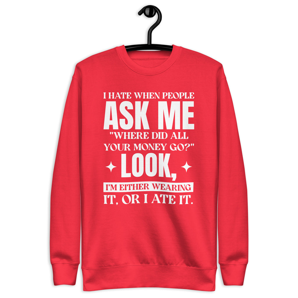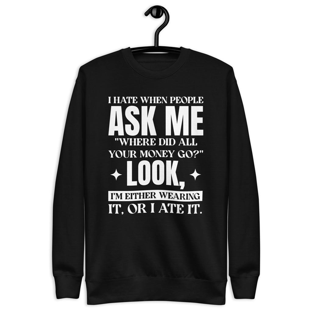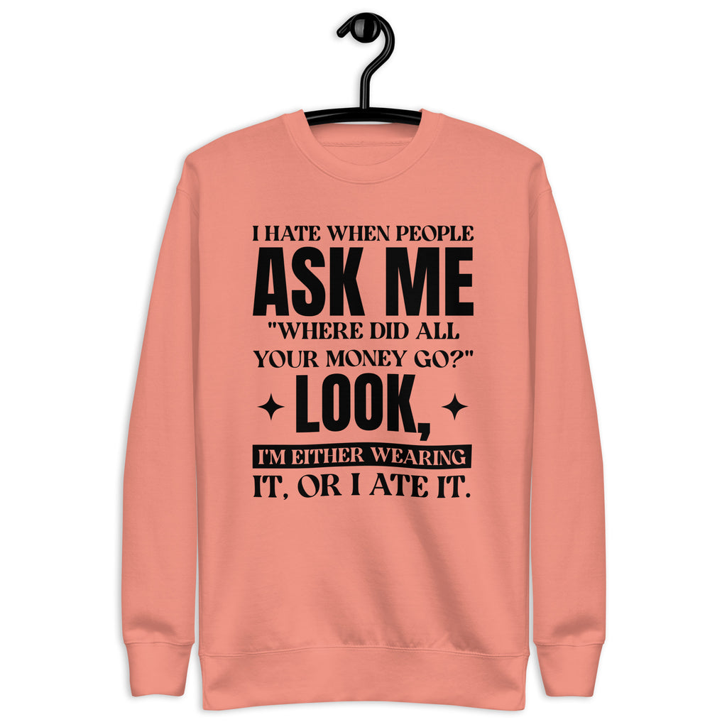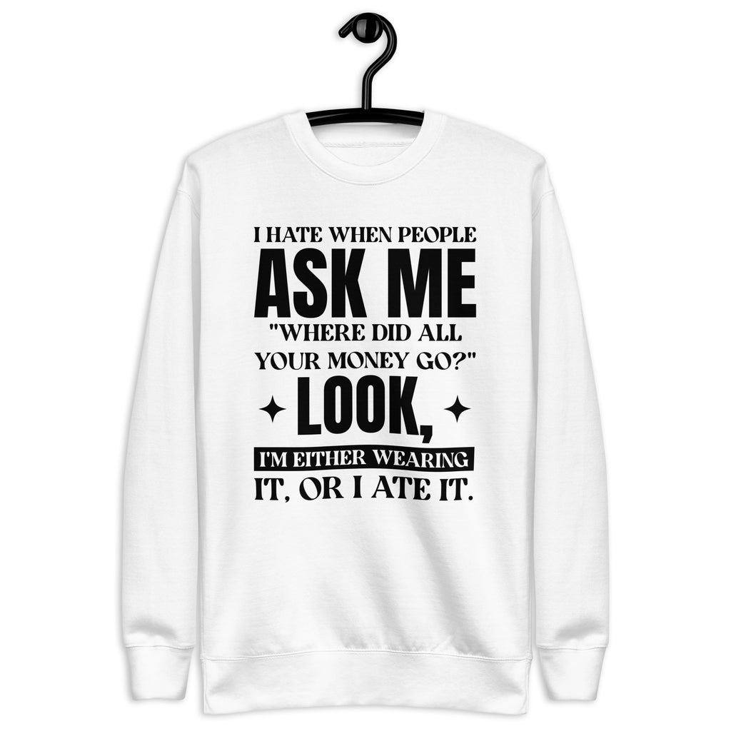Let your wardrobe and appetite speak for themselves with this “I hate when people ask me ‘Where did all your money go?’ Look, I’m either wearing it or I ate it” sweatshirt! Perfect for fashion lovers, food enthusiasts, and anyone who proudly invests in carbs and cute clothes, this cozy piece delivers humor, honesty, and comfort all in one.