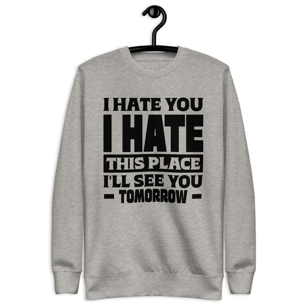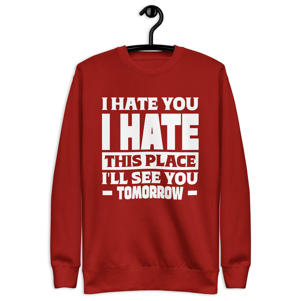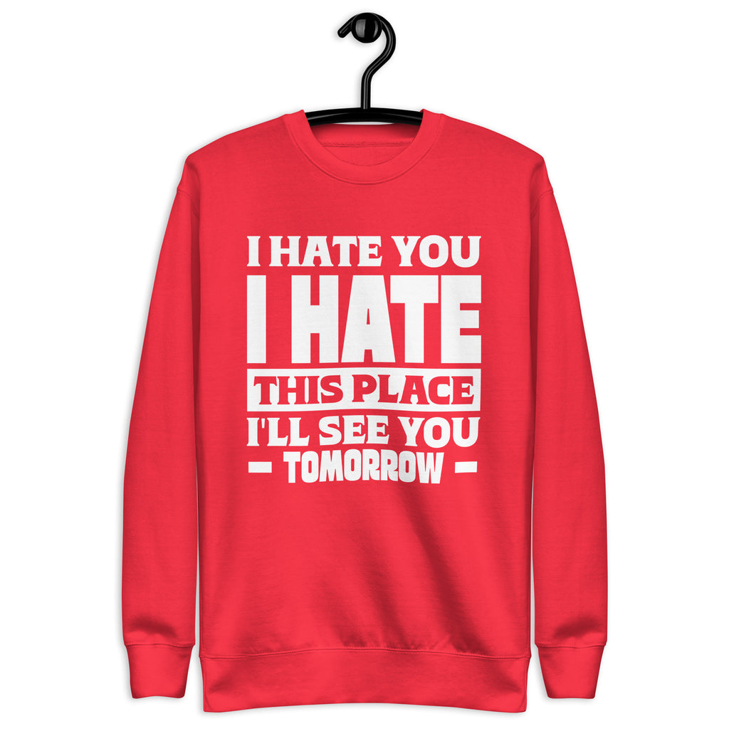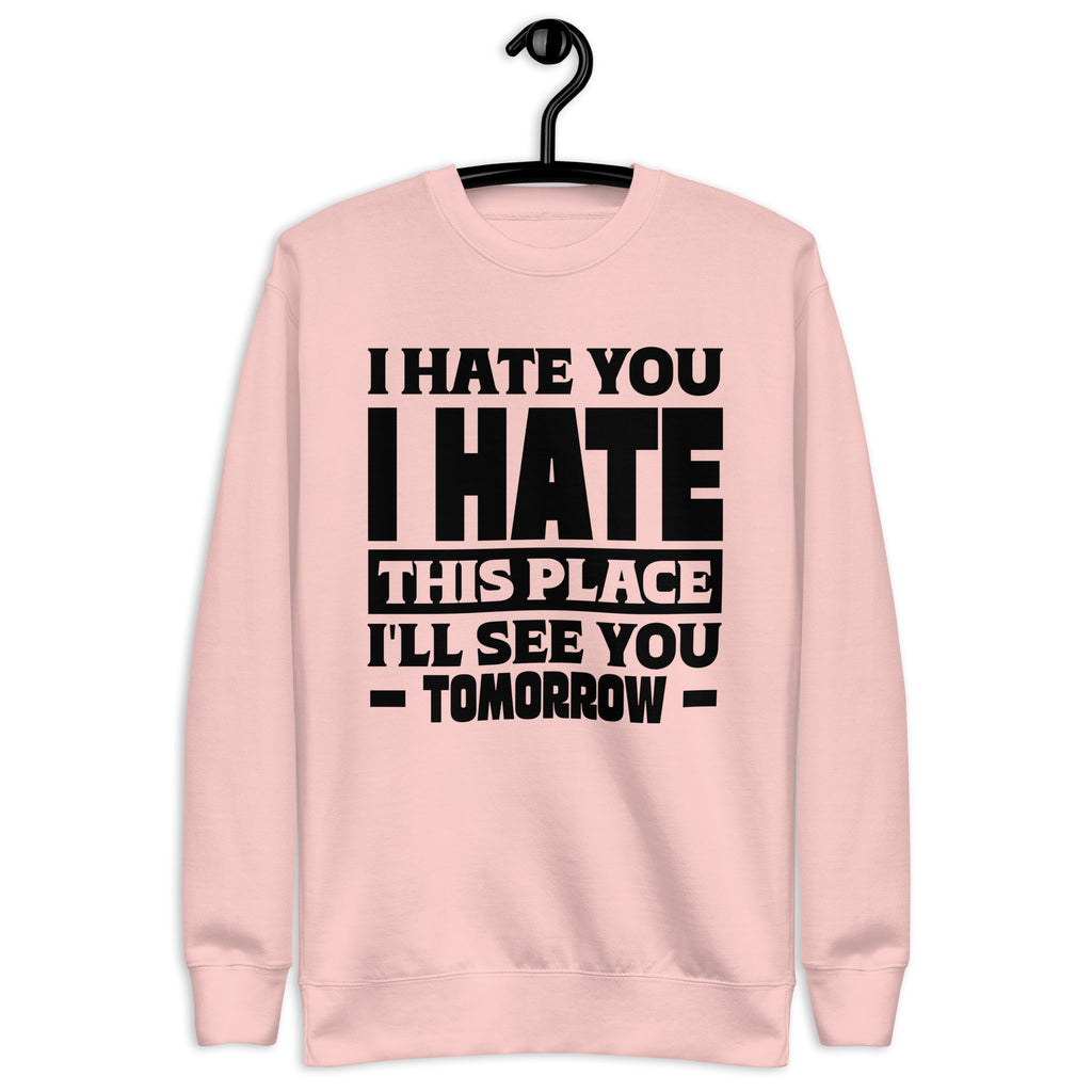 Blunt, dramatic, and emotionally unavailable — this “I Hate You, I Hate This Place, I’ll See You Tomorrow” sweatshirt is for the souls who are fed up yet still weirdly loyal. If your vibe is “I can’t stand any of you but unfortunately I’m coming back,” this is your wardrobe soulmate. Perfect for those who complain loudly, love quietly, and somehow show up again anyway.