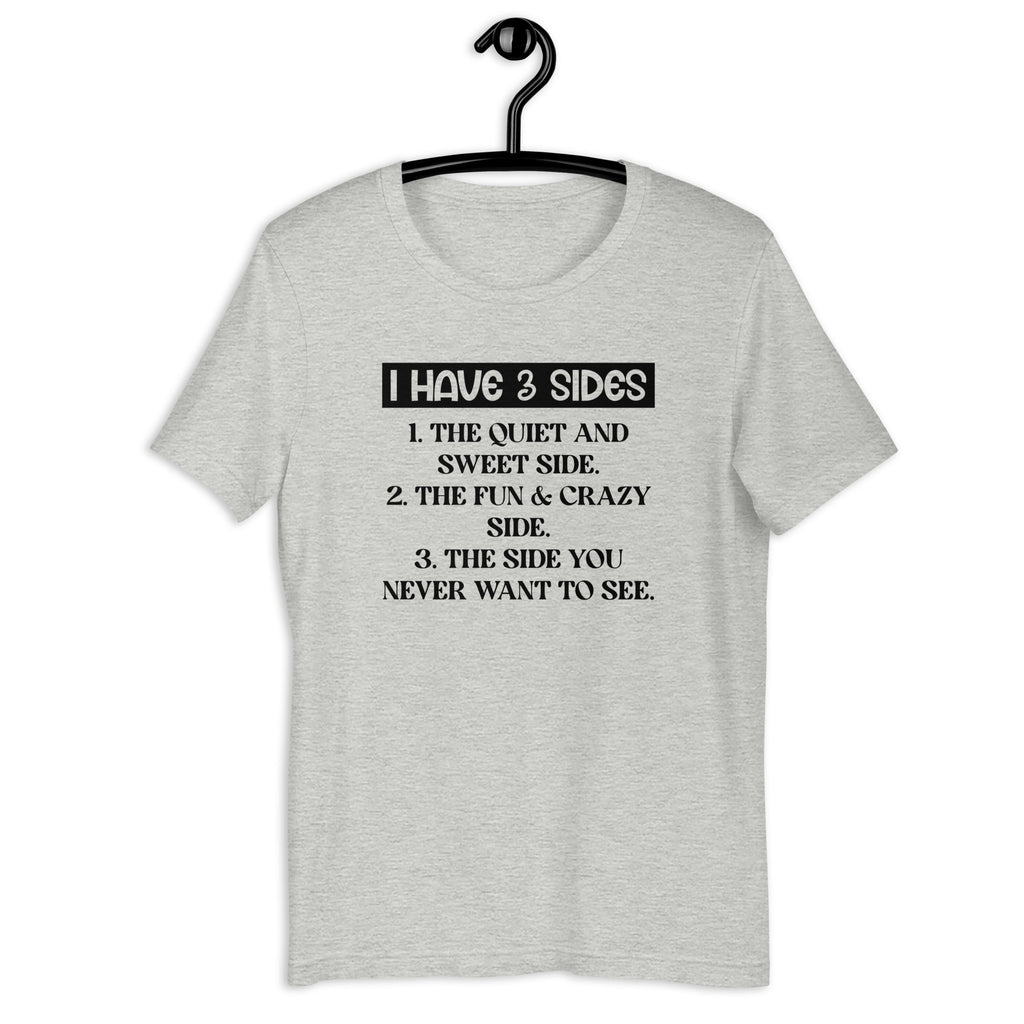 Show off every part of your personality with the “I Have 3 Sides: 1. Quiet and Sweet Side 2. The Fun and Crazy Side 3. The Side You Never Want to See” t-shirt. Equal parts sassy and relatable, this tee is perfect for anyone who knows they’re more than just one mood. From sweet to savage, it tells the world you’ve got layers—and a warning label.