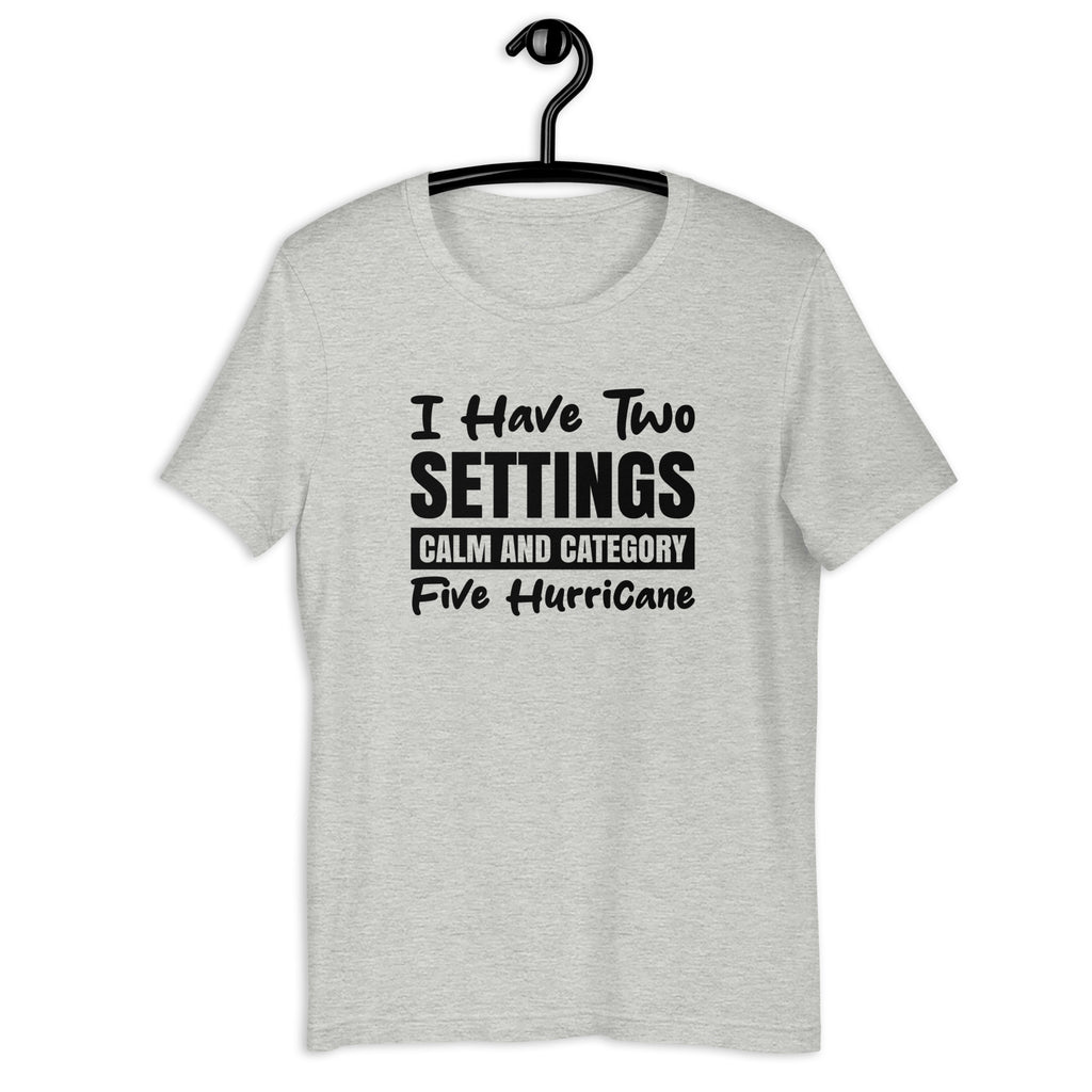 Bring the drama with the “I Have Two Settings: Calm and Category Five Hurricane” T-shirt. Perfect for anyone who goes from peaceful to powerful in 0.2 seconds, this tee captures the hilarious truth of having exactly two modes: quiet… and absolute chaos.