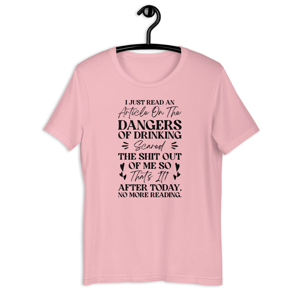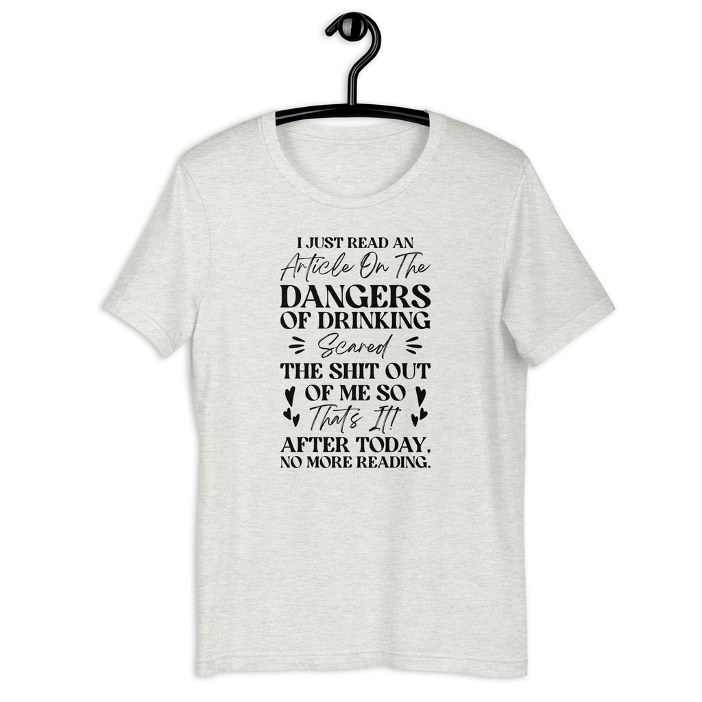 Show off your witty sense of humor with the “I Just Read an Article on the Dangers of Drinking — Scared the Shit Out of Me. So That’s It, After Today, No More Reading” T-shirt. Perfect for anyone who appreciates a good laugh and a clever twist, this tee delivers sarcasm, personality, and a toast to never taking life too seriously.