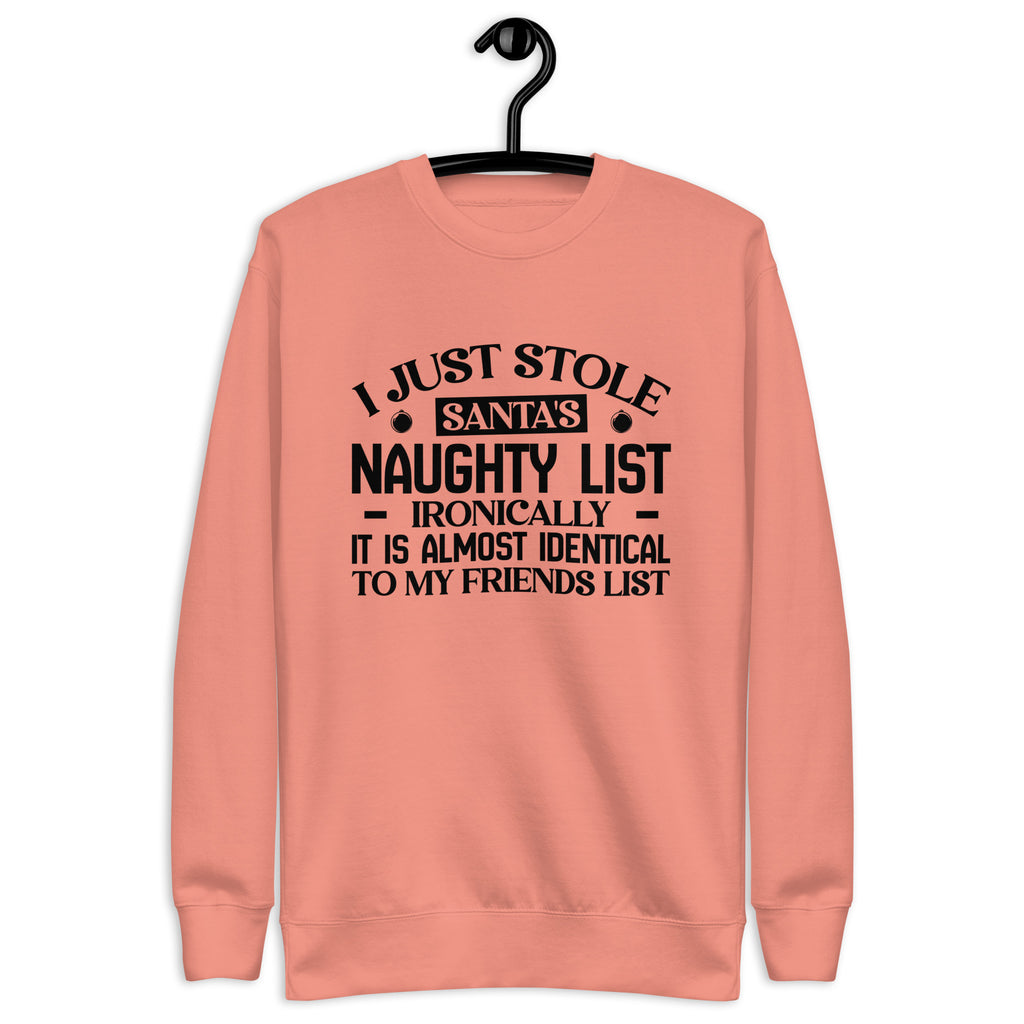 Funny, cheeky, and holiday-ready. The “I Just Stole Santa’s Naughty List Ironically—It Is Almost Identical to My Friends List” sweatshirt is perfect for those who love playful mischief and holiday humor. It’s a witty twist on festive fun that’s guaranteed to get laughs.