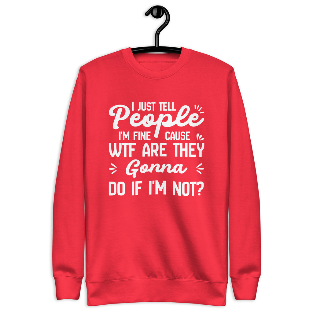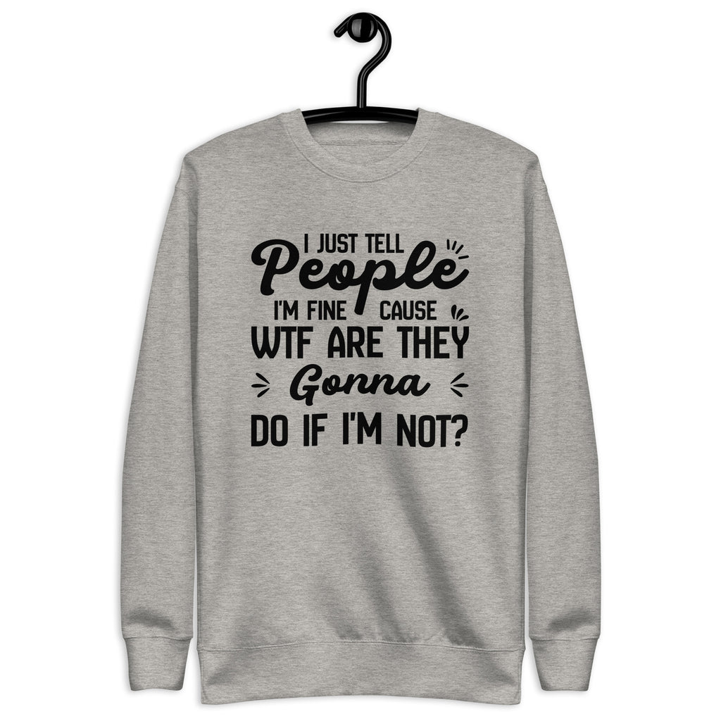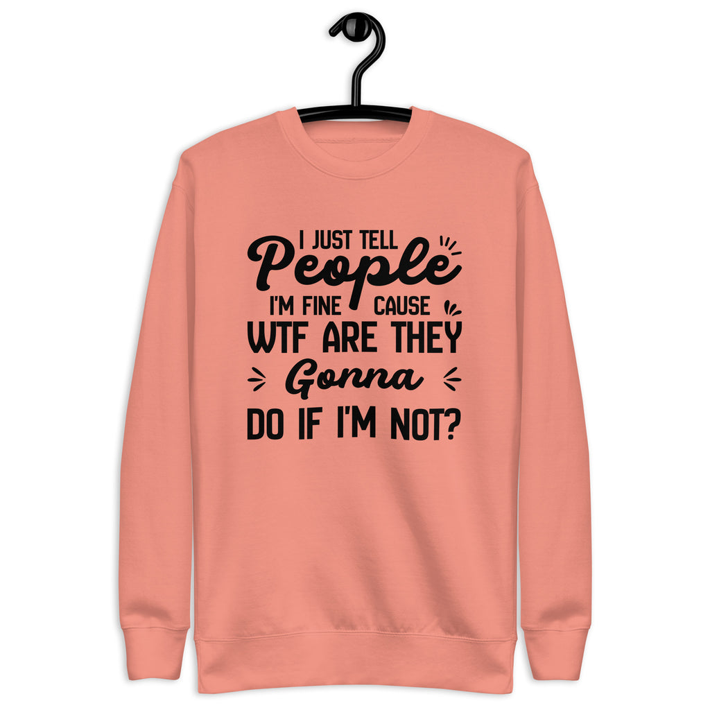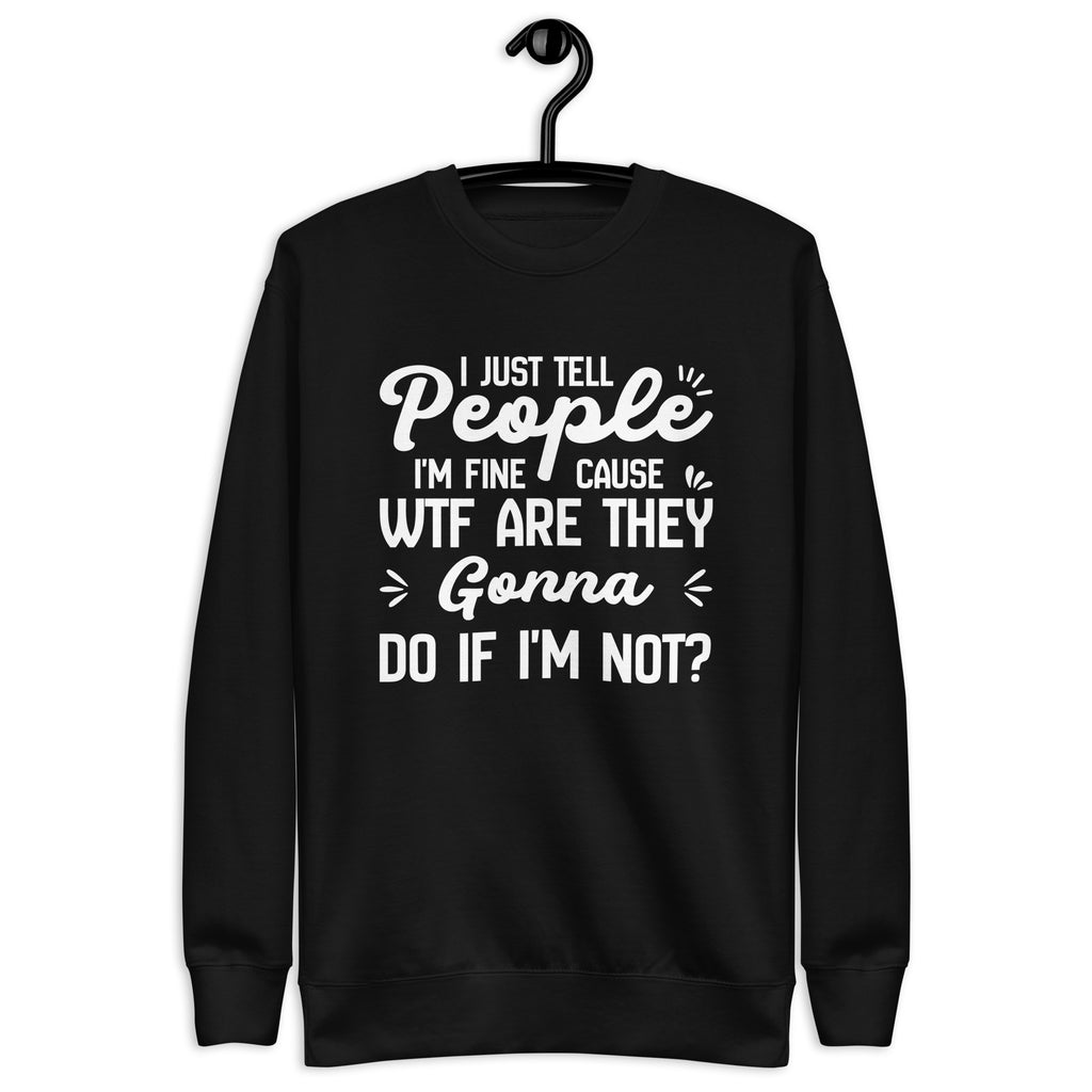 Bold, sarcastic, and painfully relatable. The “I Just Tell People I’m Fine — ’Cause WTF Are They Gonna Do If I’m Not?” sweatshirt says what most people think but never say out loud. It’s a blunt, humor-laced take on modern coping that mixes honesty with a no-nonsense attitude.