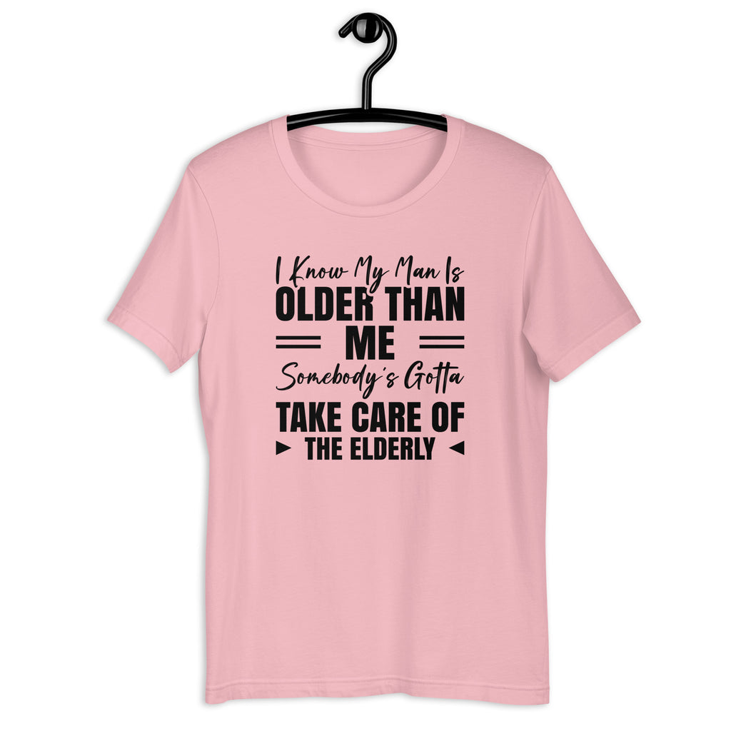Funny, bold, and full of playful attitude. The “I Know My Man Is Older Than Me — Somebody’s Gotta Take Care of the Elderly” T-shirt is made for those who love to joke about age gaps with confidence and humor. Lighthearted and cheeky, it’s the perfect conversation starter.