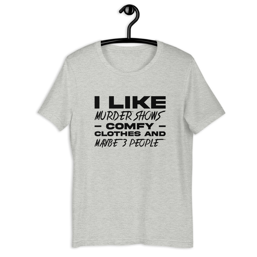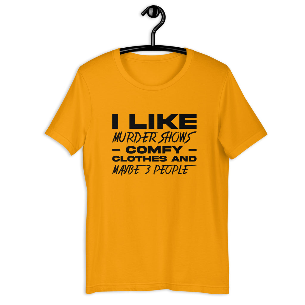 Witty, dark, and unapologetically introverted. The “I Like Murder Shows, Comfy Clothes, and Maybe 3 People” t-shirt is perfect for true-crime lovers who value comfort, sarcasm, and a very small social circle. It delivers dry humor with a cozy vibe, making your priorities loud and clear—without saying a word.