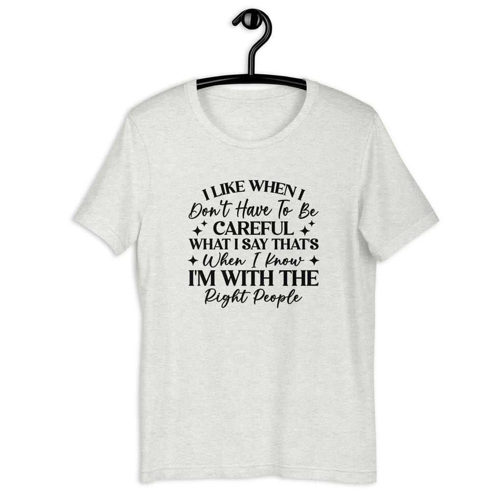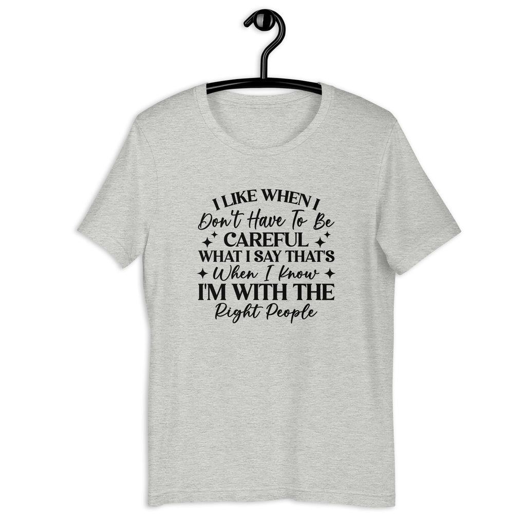 Celebrate true friendship with this “I Like When I Don’t Have to Be Careful What I Say, That’s When I Know I’m With the Right People” t-shirt. Heartfelt, genuine, and a little witty, this tee is perfect for anyone who treasures those unfiltered, laugh-until-it-hurts connections.