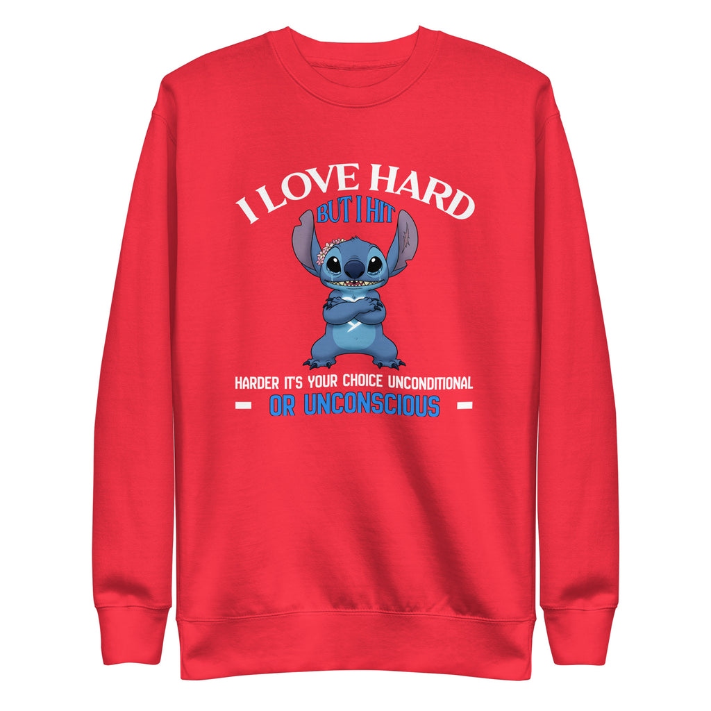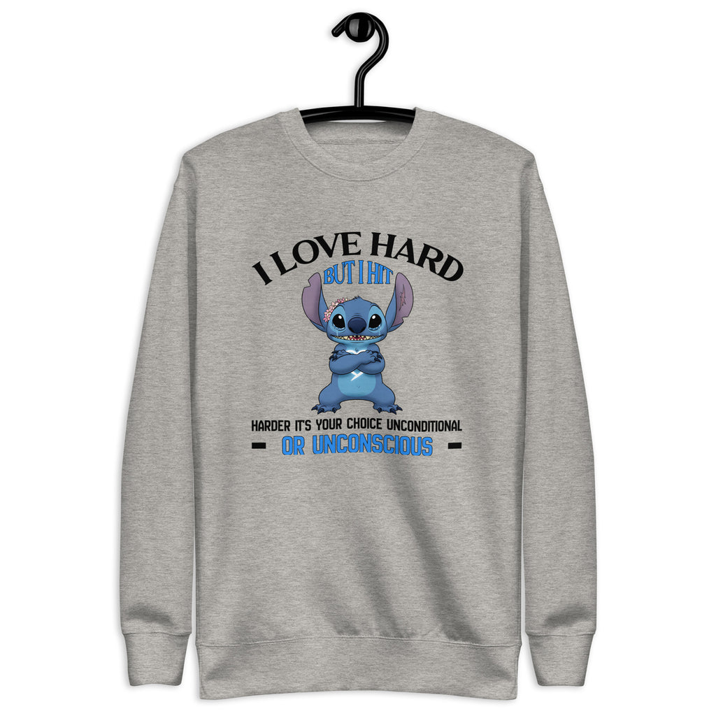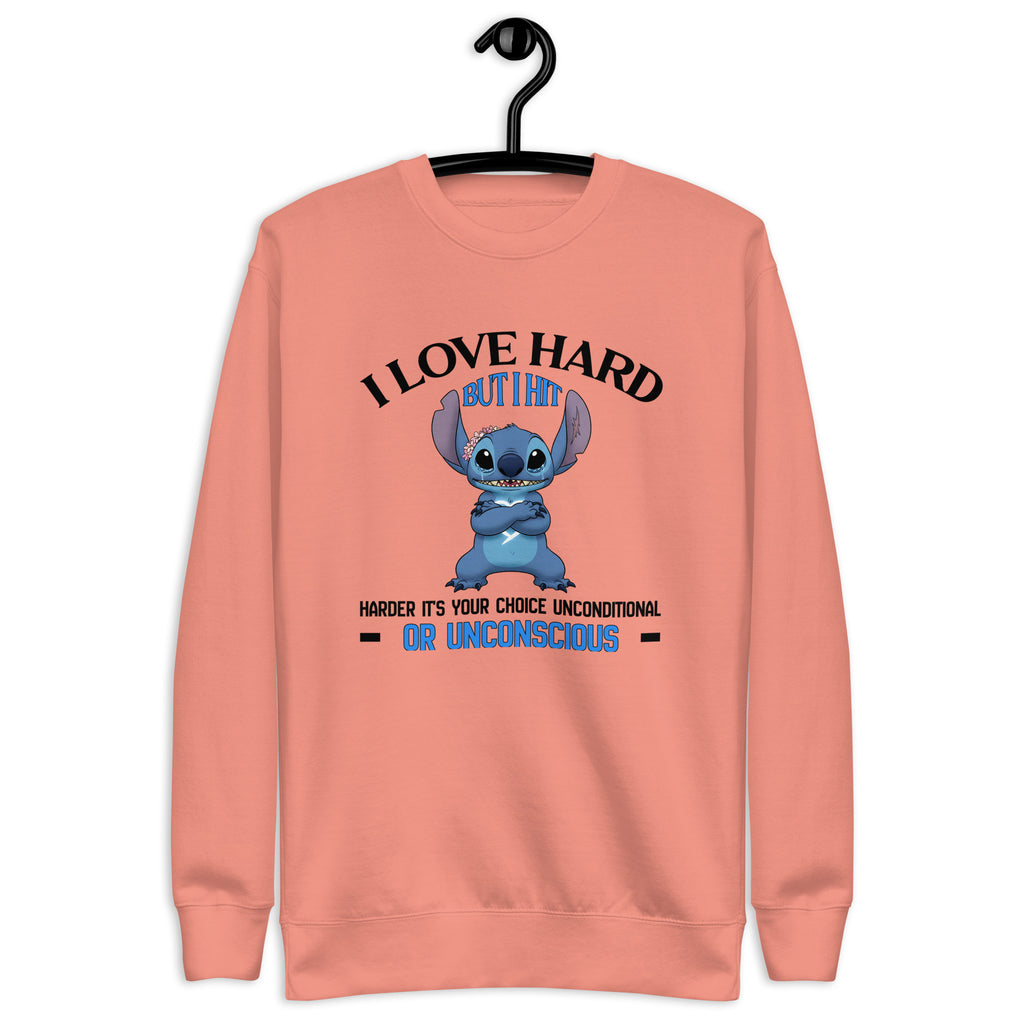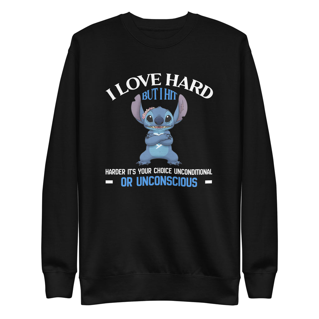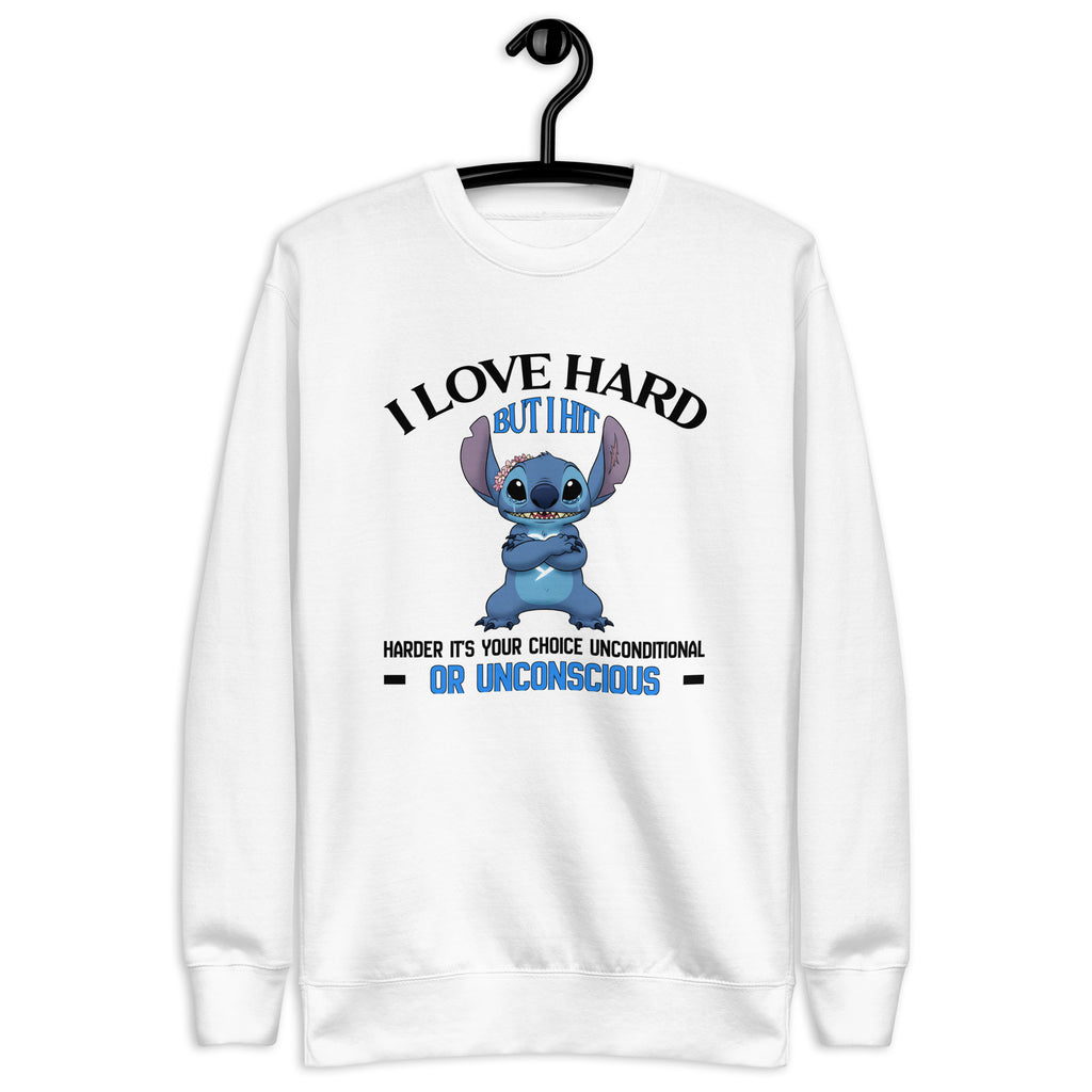 Make your intensity unmistakable with the “I Love Hard, But I Hit Harder — It’s Your Choice: Unconditional or Unconscious” sweatshirt. Designed for those who are fiercely loyal but absolutely not to be tested, this piece blends dark humor with unapologetic confidence.