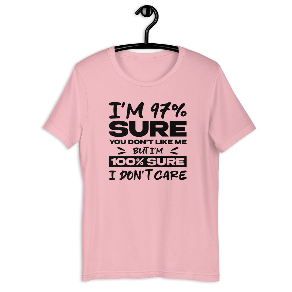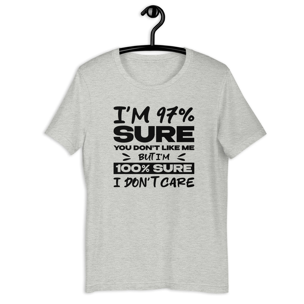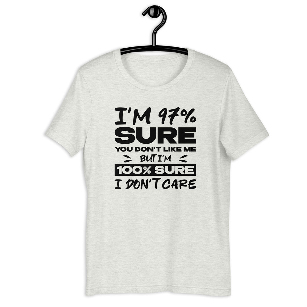 Keep your confidence sky-high and your care level at zero with this “I’m 97% Sure You Don’t Like Me, But I’m 100% Sure I Don’t Care” t-shirt. Perfect for anyone who lives unapologetically and doesn’t waste energy on other people’s opinions, this bold tee blends humor, attitude, and self-assured style in one perfect package.