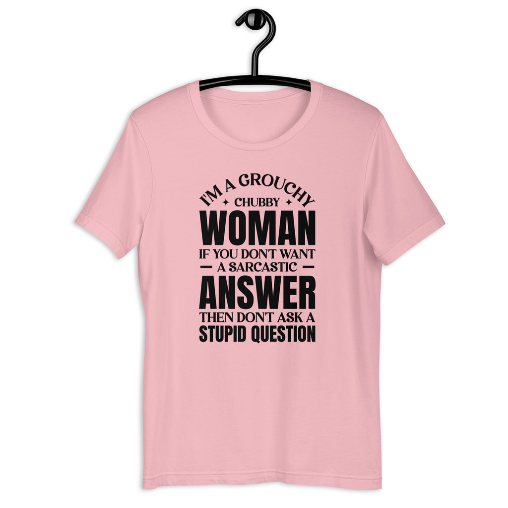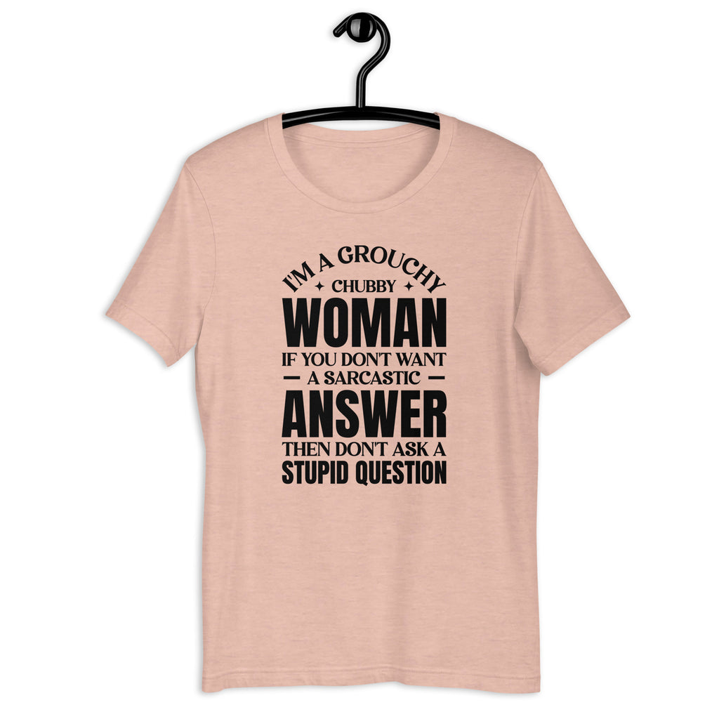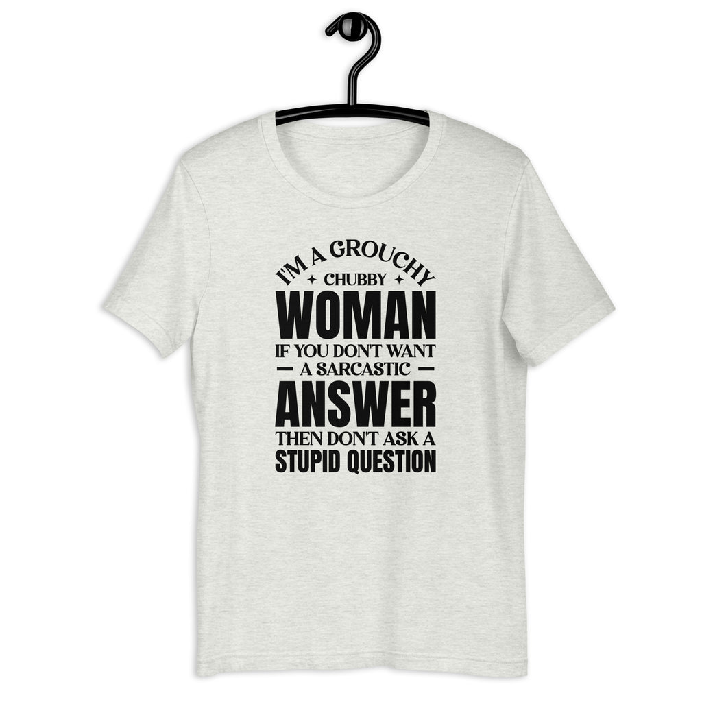 Show off your unapologetic attitude with the “I’m a Grouchy Chubby Woman – If You Don’t Want a Sarcastic Answer Then Don’t Ask a Stupid Question” t-shirt. Perfect for women who embrace their confidence, humor, and a little bit of sass, this tee makes a statement without saying a word.