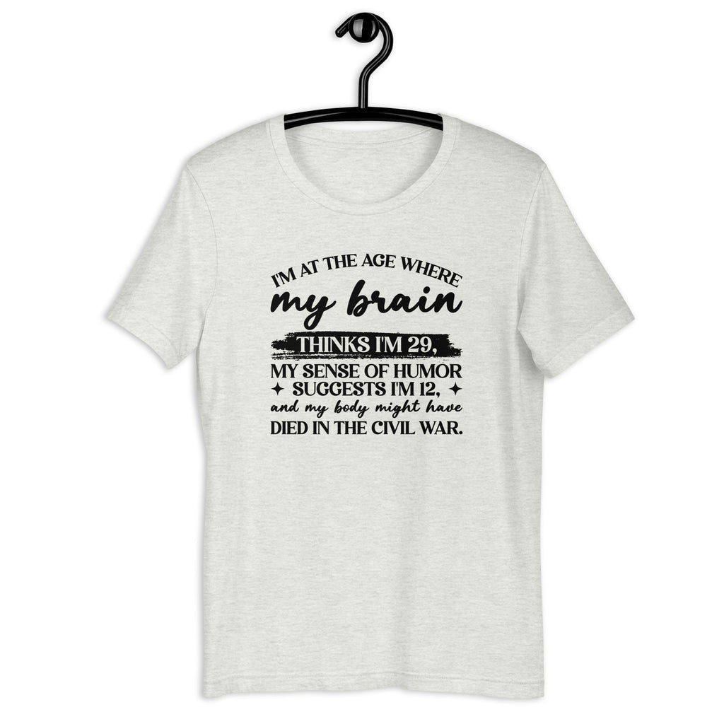 Embrace the chaos of aging with the “I’m at the age where my brain thinks I’m 29, my sense of humor suggests I’m 12, and my body might have died in the Civil War” t-shirt. This hilarious design perfectly sums up that stage of life where you feel young at heart—but your back, knees, and everything else strongly disagree.