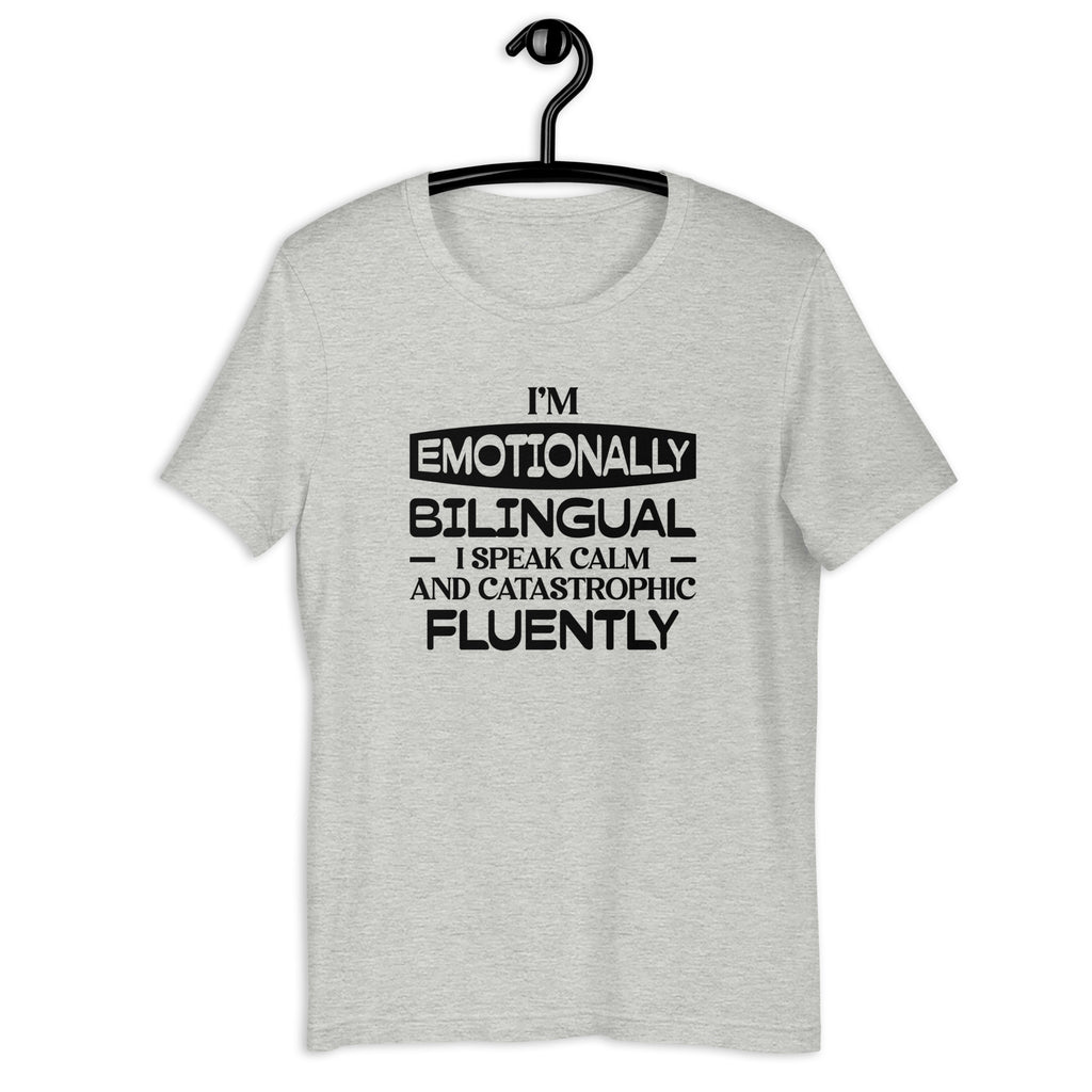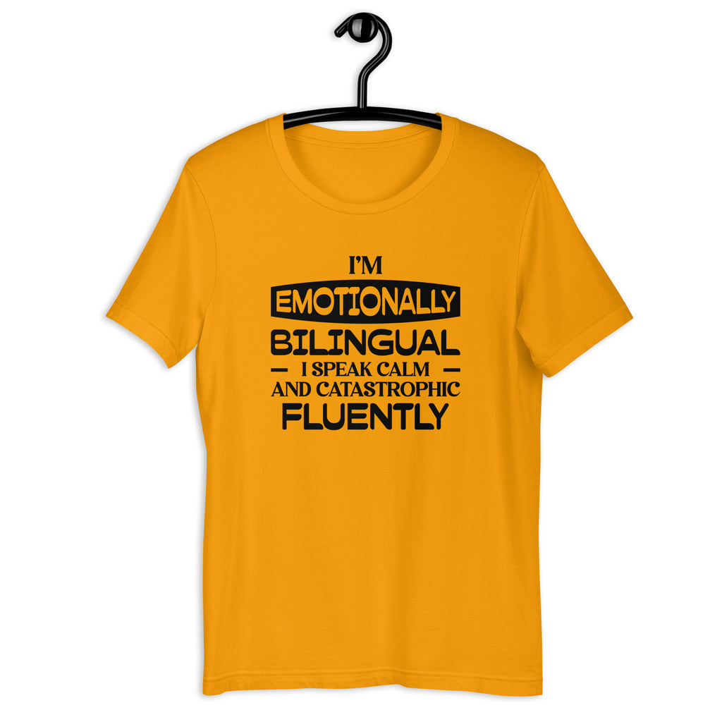 Embrace your perfectly balanced chaos with the “I’m Emotionally Bilingual — I Speak Calm and Catastrophic Fluently” T-shirt. Ideal for anyone who shifts between serene and spiraling with impressive skill, this tee captures the hilarious reality of managing life with both peaceful composure and dramatic flair.