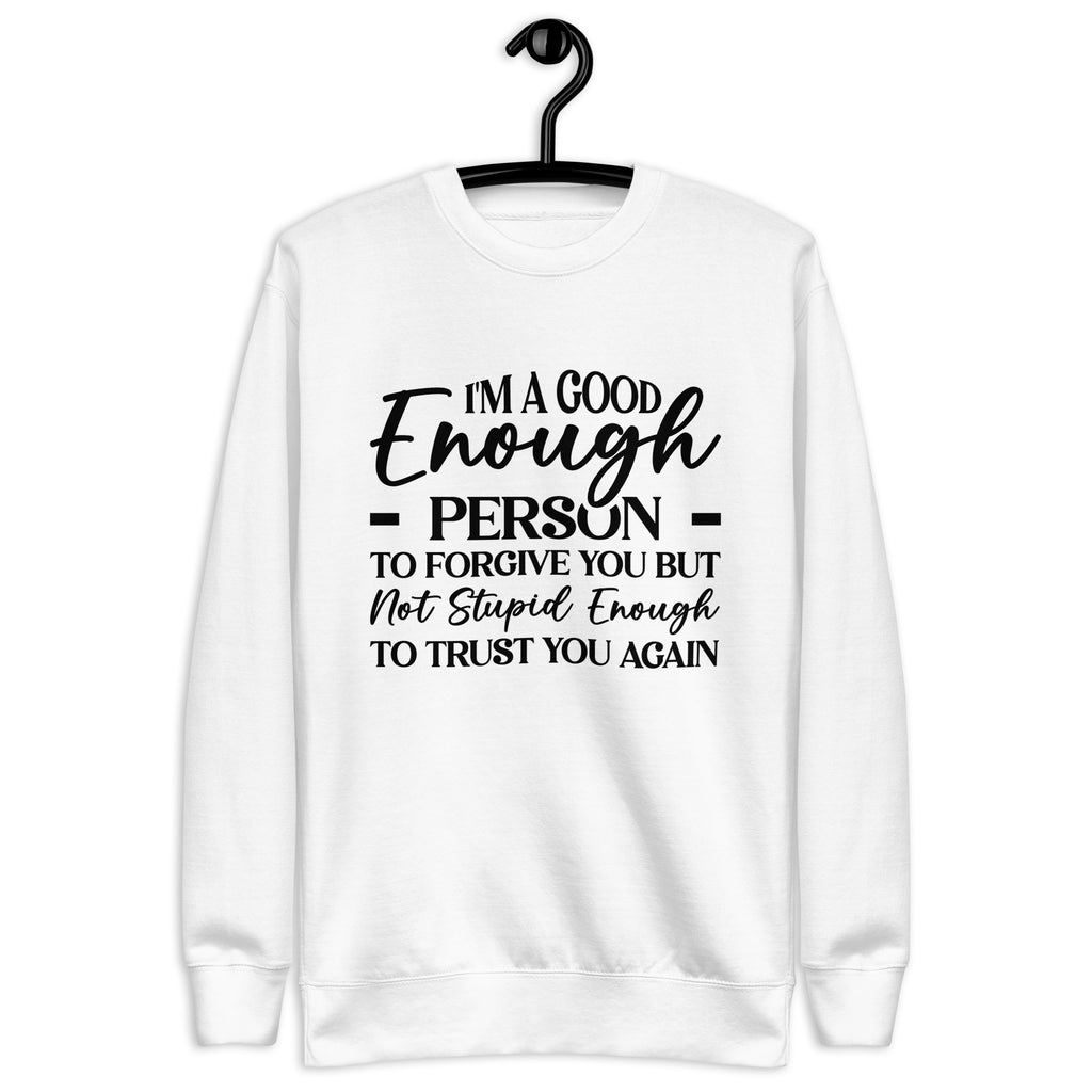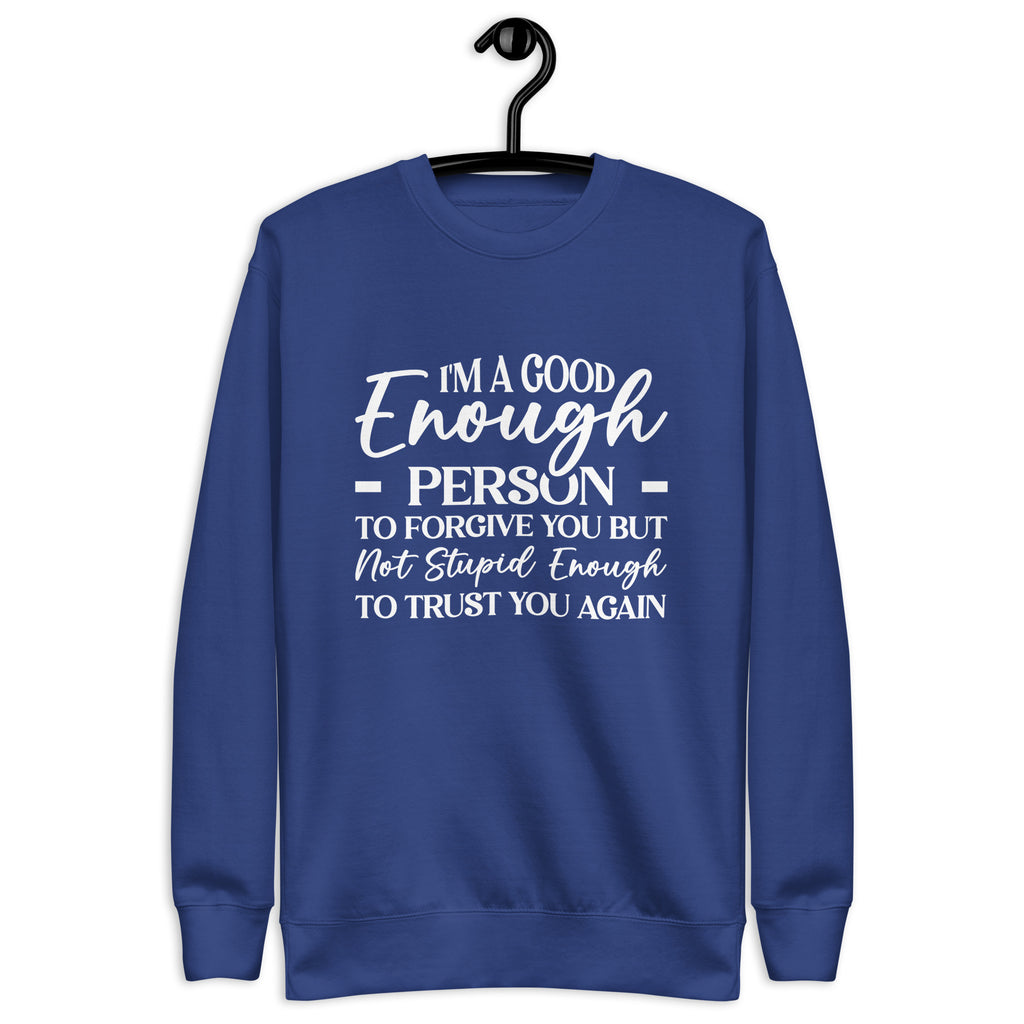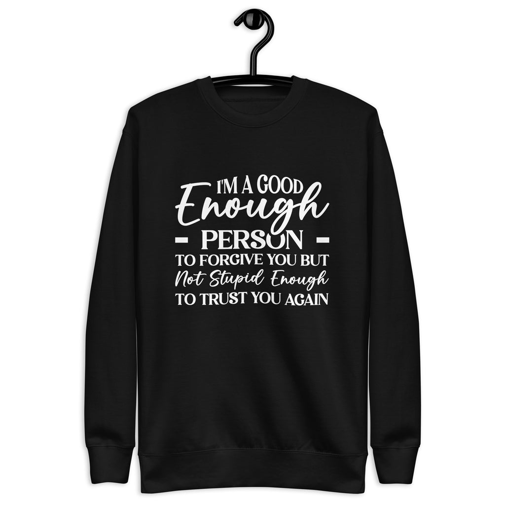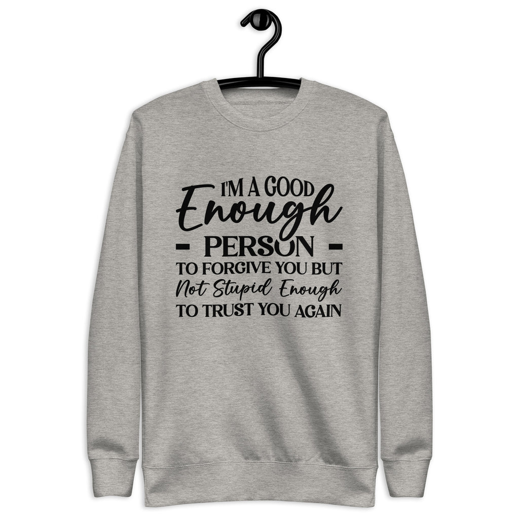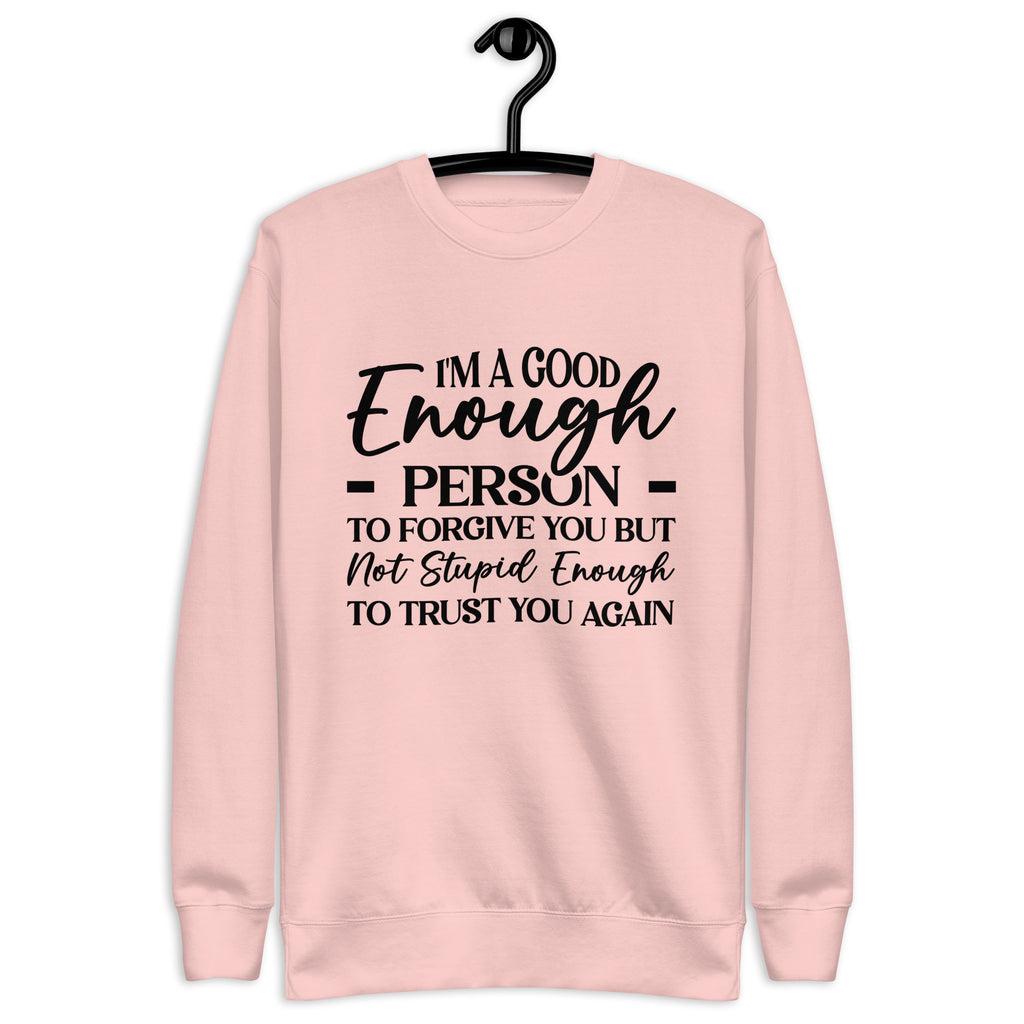Strong, self-aware, and unapologetically wise. The “I’m Good Enough to Forgive You, But Not Stupid Enough to Trust You Again” sweatshirt is for those who’ve learned their lessons and set firm boundaries. It speaks to growth, self-respect, and the power of moving forward without forgetting.