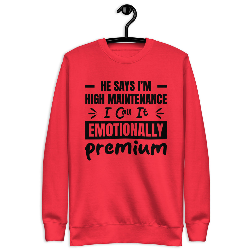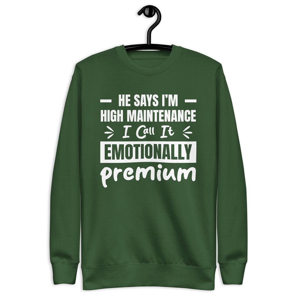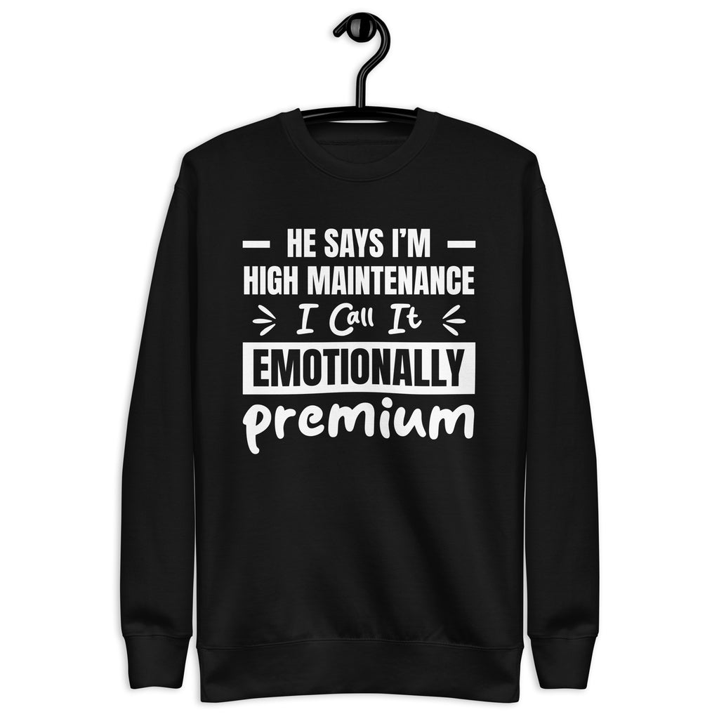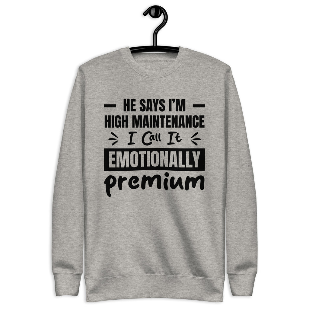 He Says I’m High Maintenance — I Call It Emotionally Premium” This “He Says I’m High Maintenance — I Call It Emotionally Premium” sweatshirt is for the ones who know their worth and don’t apologize for it. Confident, sassy, and a little bit extra, it’s made for anyone who treats self-respect like a luxury brand.