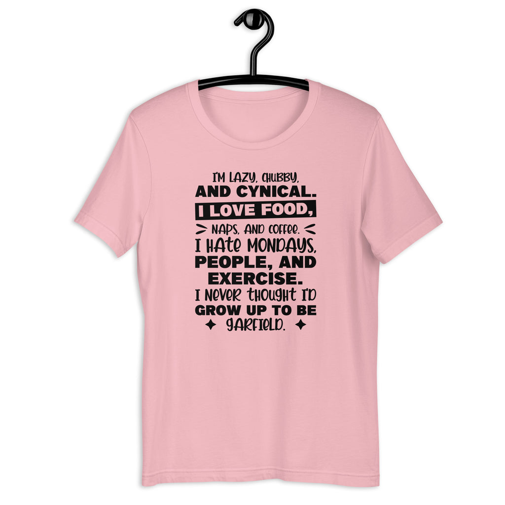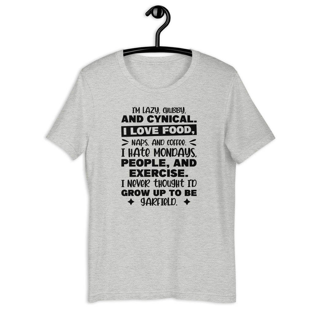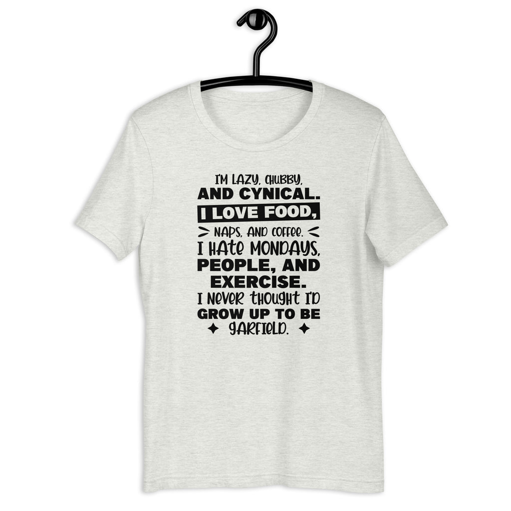 Embrace your inner Garfield with the “I’m Lazy, Chubby, and Cynical — I Love Food, Naps, and Coffee. I Hate Mondays, People, and Exercise. I Never Thought I’d Grow Up to Be Garfield” T-shirt. Perfect for anyone who relates a little too much to the world’s most iconic grumpy cat, this tee delivers comfort, humor, and total honesty in one cozy package.