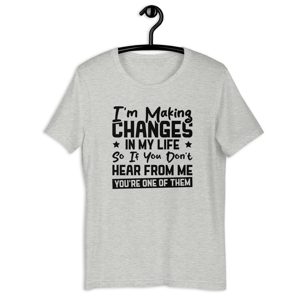 Bold, decisive, and unapologetically selective. The “I’m Making Changes in My Life — So If You Don’t Hear From Me, You’re One of Them” t-shirt is made for those who prioritize growth and know when to let go. It’s a clear, confident statement about boundaries, self-care, and moving forward without looking back.