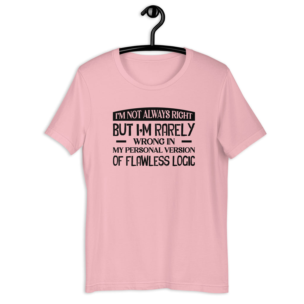Own your confidence with the “I’m Not Always Right, But I’m Rarely Wrong in My Personal Version of Flawless Logic” T-shirt. Perfect for anyone who stands firmly by their opinions — even when they’re creatively justified — this tee captures the humor of being unapologetically sure of yourself.