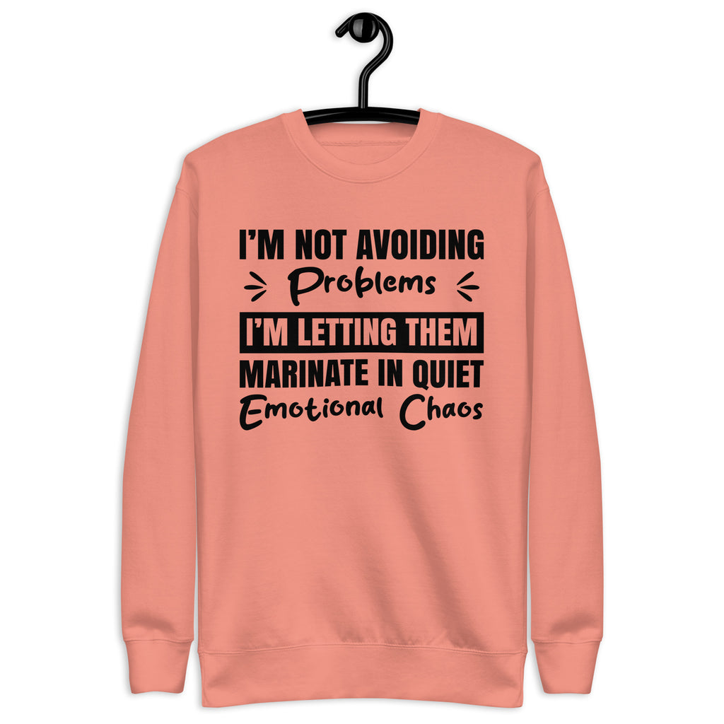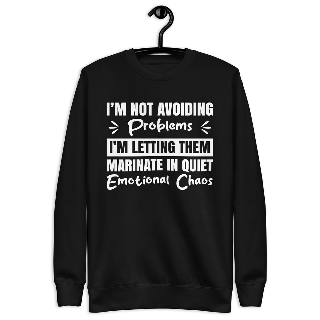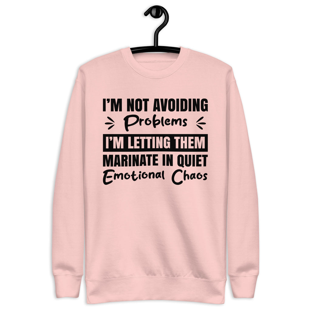 Thoughtful, chaotic, and practicing a very specific form of patience — this “I’m Not Avoiding Problems, I’m Letting Them Marinate in Quiet Emotional Chaos” sweatshirt is made for anyone who processes life on their own timeline. You’re not running away — you’re just giving your problems time to season, simmer, and maybe solve themselves.