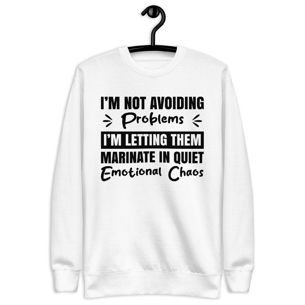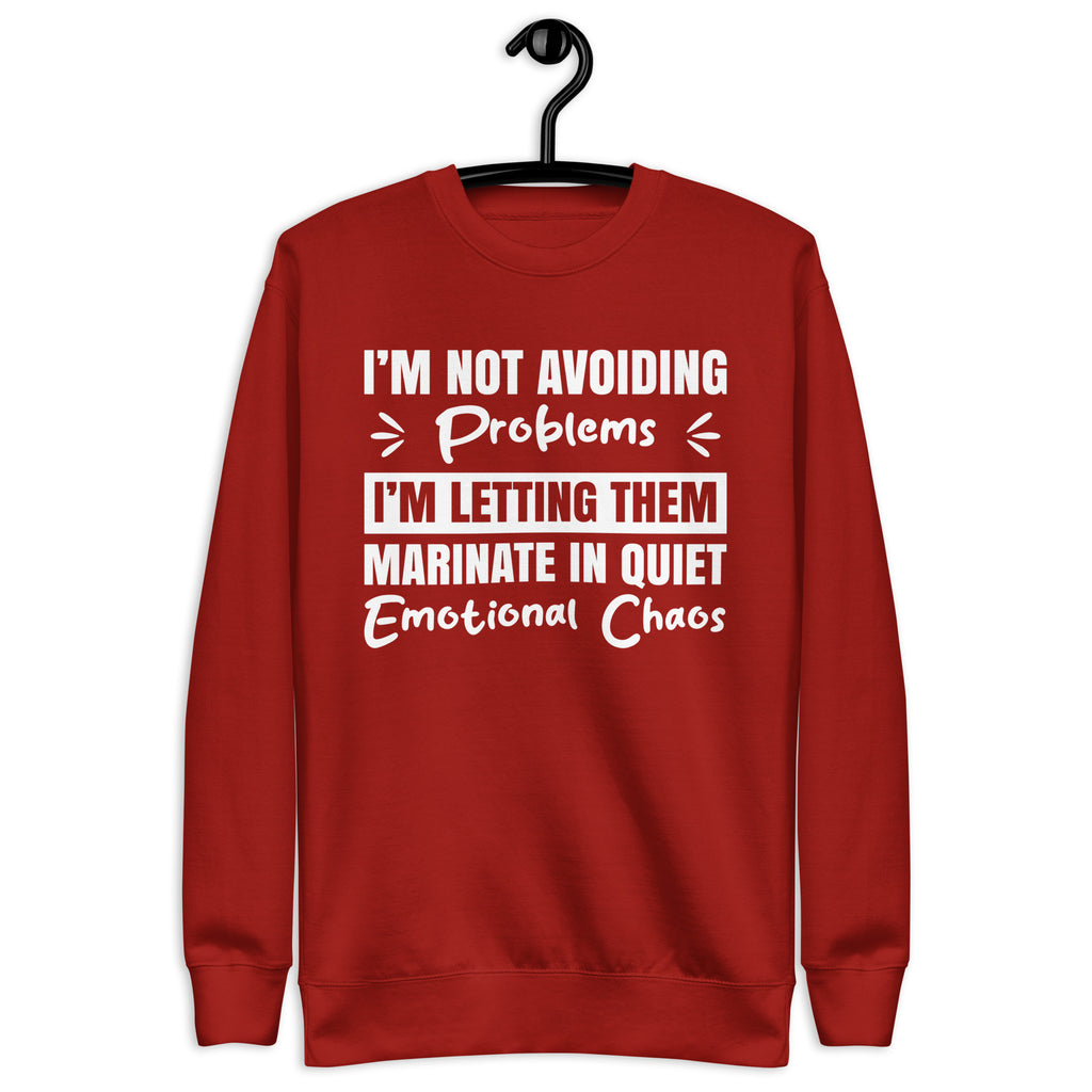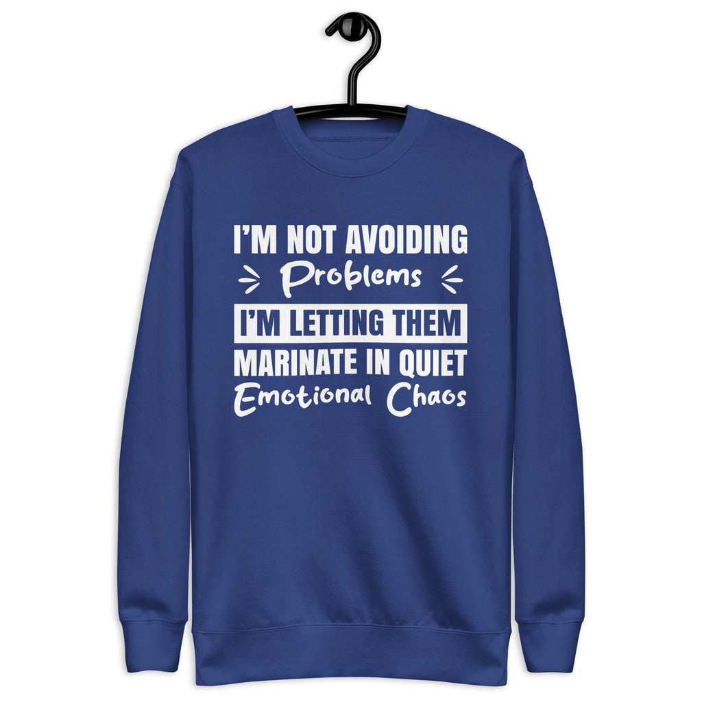 Thoughtful, chaotic, and practicing a very specific form of patience — this “I’m Not Avoiding Problems, I’m Letting Them Marinate in Quiet Emotional Chaos” sweatshirt is made for anyone who processes life on their own timeline. You’re not running away — you’re just giving your problems time to season, simmer, and maybe solve themselves.