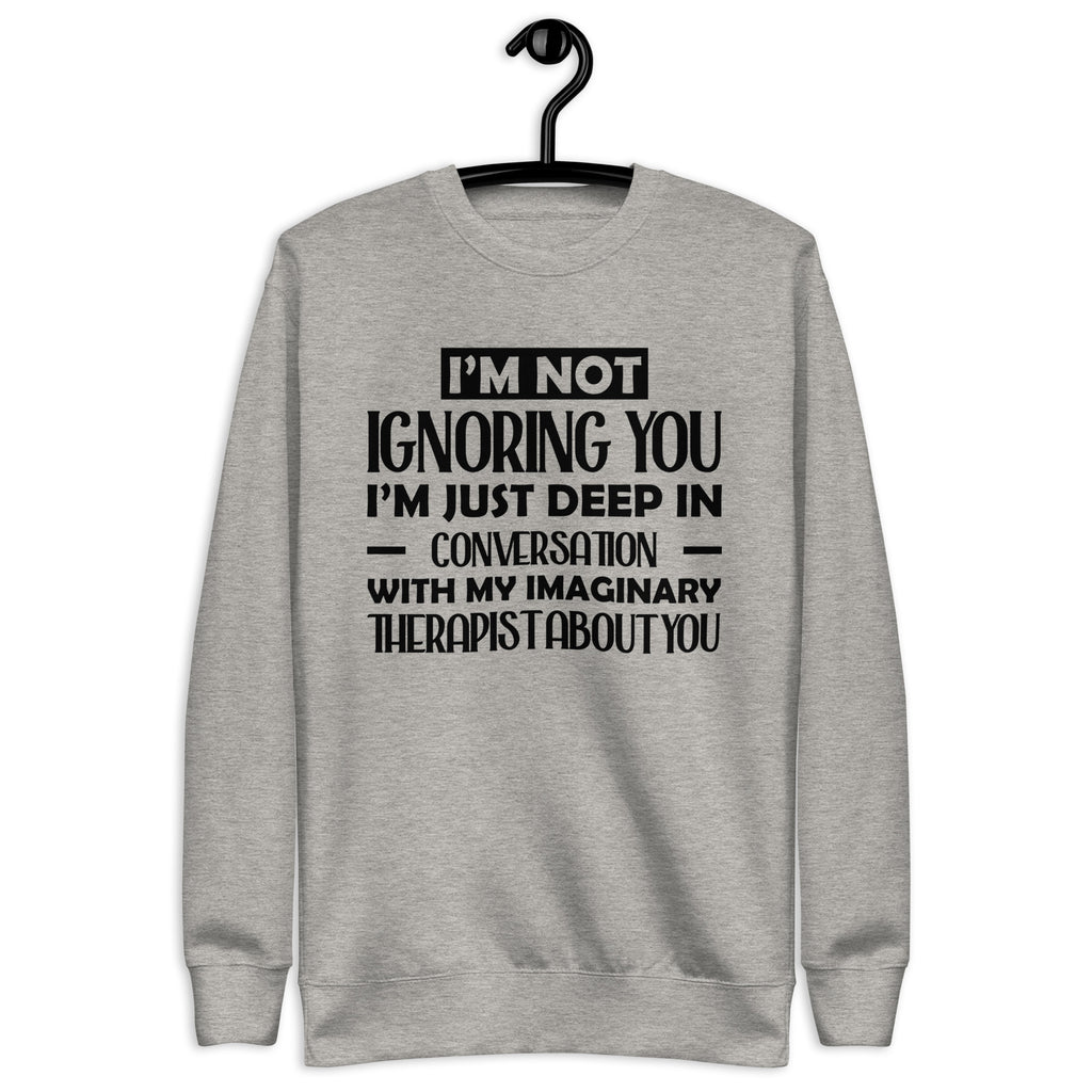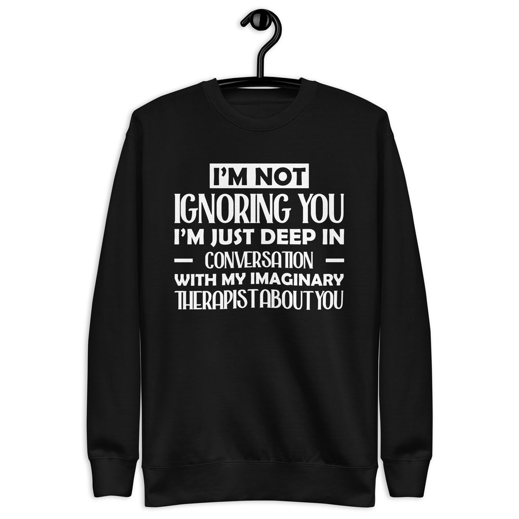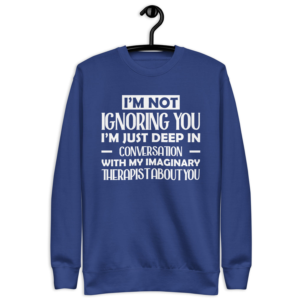 Playful, introspective, and a little too honest — this “I’m Not Ignoring You, I’m Just Deep in Conversation With My Imaginary Therapist About You” sweatshirt is made for anyone whose inner dialogue is louder than the room. You’re not avoiding people — you’re just processing, analyzing, and consulting your unpaid mental health staff before responding.
