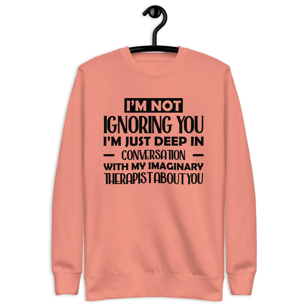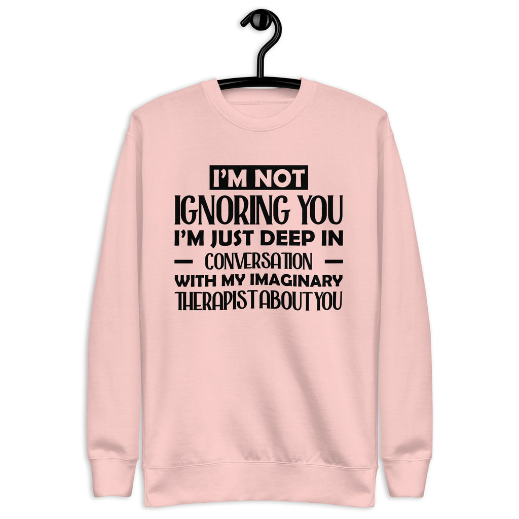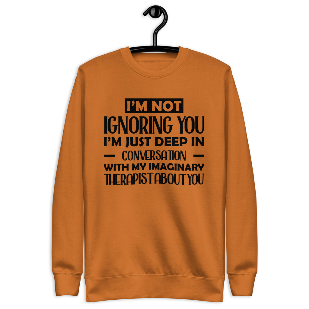 Playful, introspective, and a little too honest — this “I’m Not Ignoring You, I’m Just Deep in Conversation With My Imaginary Therapist About You” sweatshirt is made for anyone whose inner dialogue is louder than the room. You’re not avoiding people — you’re just processing, analyzing, and consulting your unpaid mental health staff before responding.