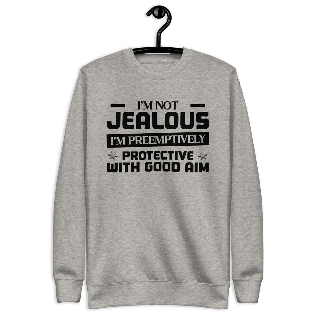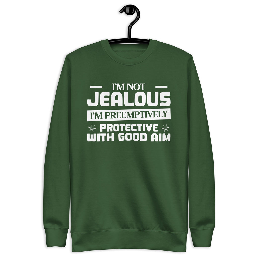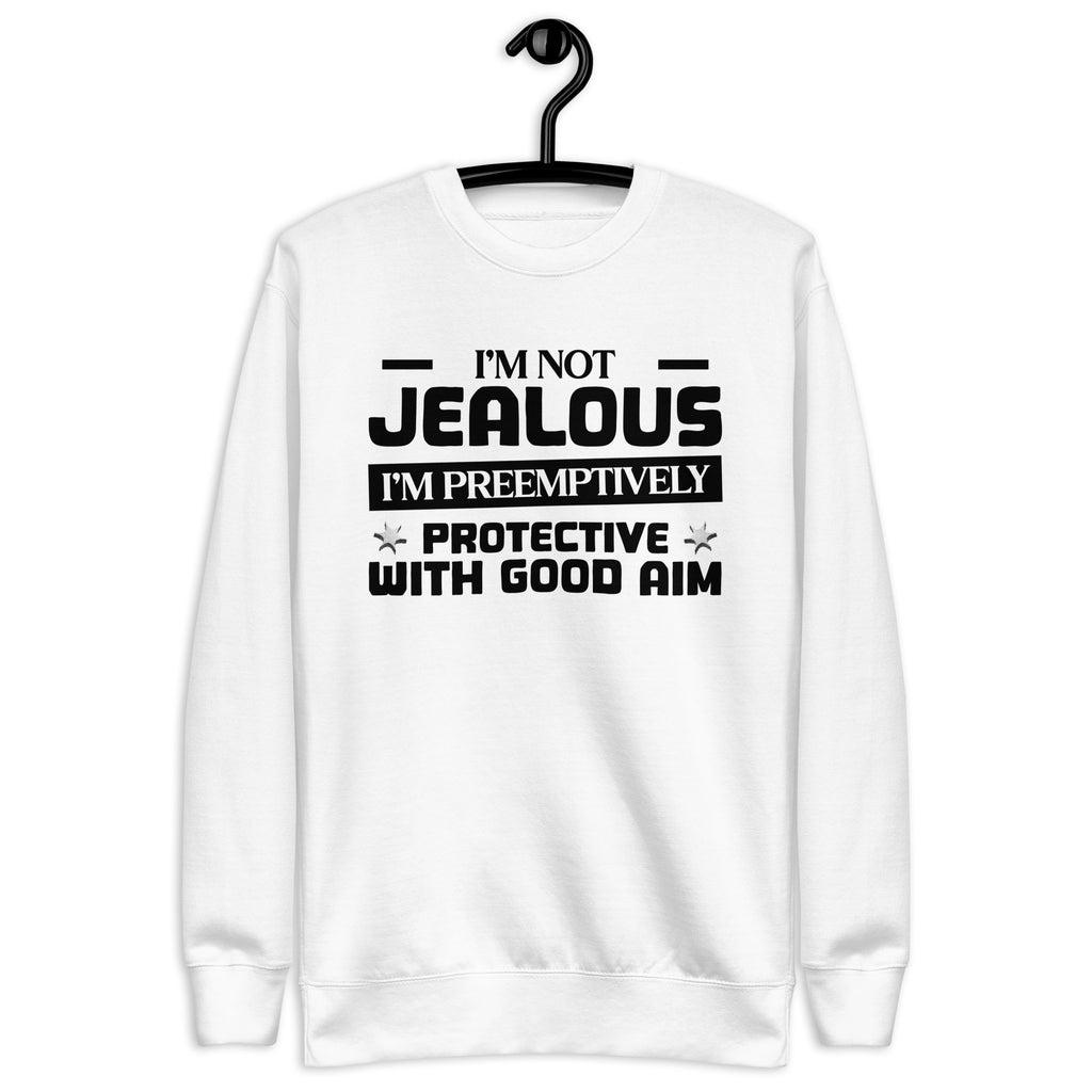 This “I’m Not Jealous — I’m Preemptively Protective with Good Aim” sweatshirt is for the lovers who mix affection with precision. Fiercely loyal and a little bit dangerous (in a charming way), it’s perfect for anyone whose love language includes keeping an eye on the competition — just in case.