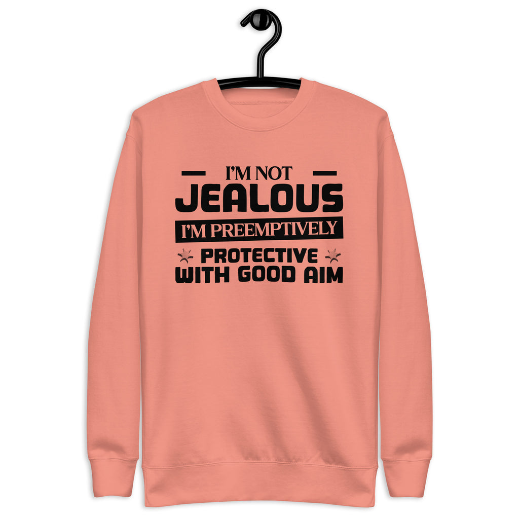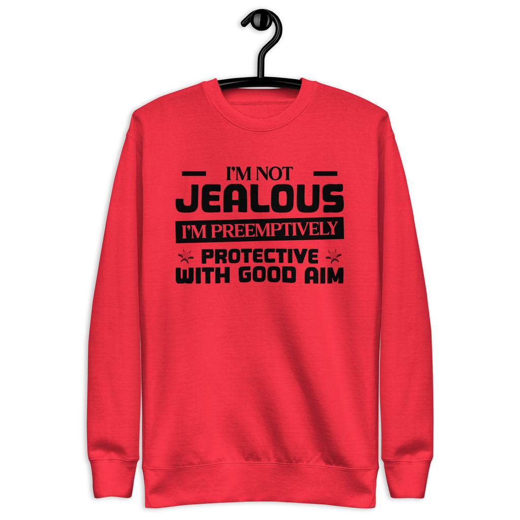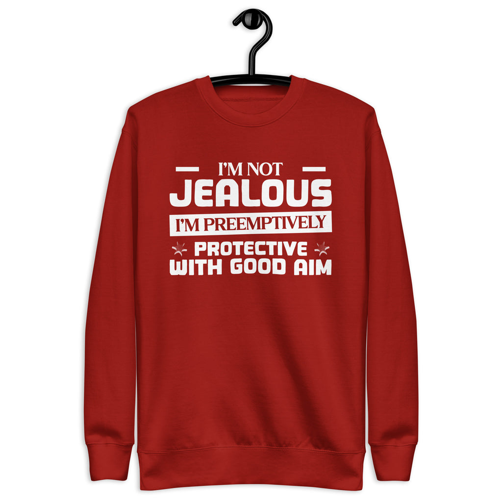 This “I’m Not Jealous — I’m Preemptively Protective with Good Aim” sweatshirt is for the lovers who mix affection with precision. Fiercely loyal and a little bit dangerous (in a charming way), it’s perfect for anyone whose love language includes keeping an eye on the competition — just in case.