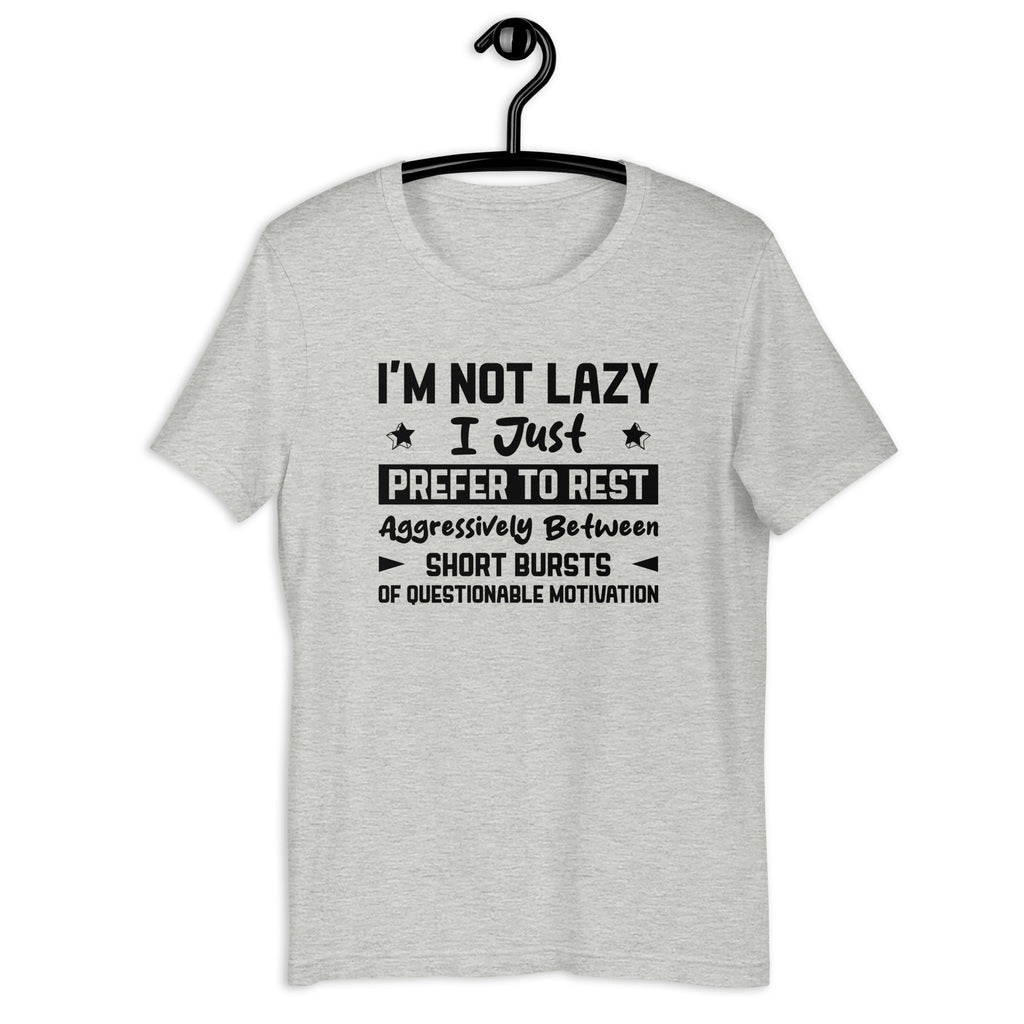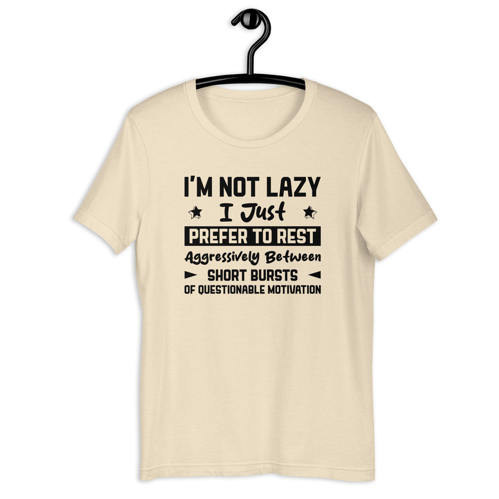 Stay real with the “I’m Not Lazy ★ I Just Prefer to Rest Aggressively Between Short Bursts of Questionable Motivation” T-shirt. Perfect for anyone who operates on sporadic energy and unapologetic relaxation, this tee captures the humor of embracing your natural recharge cycles.