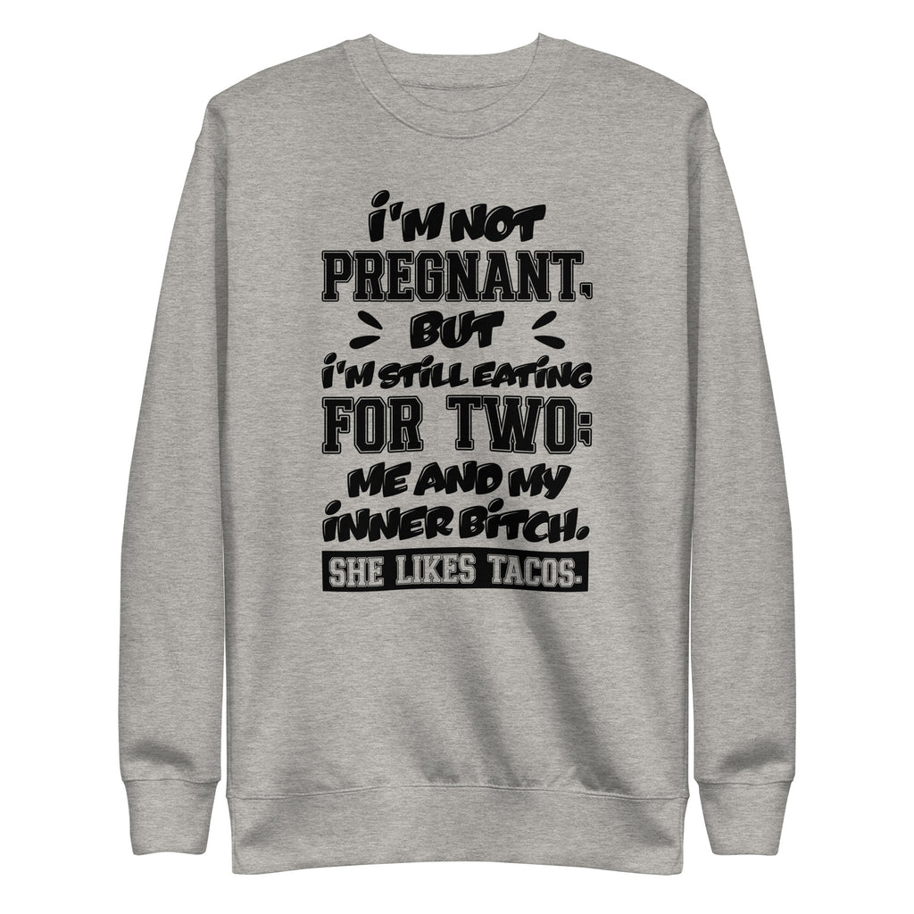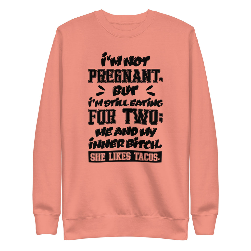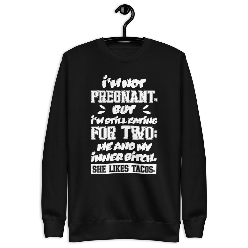 Bring some sass to your wardrobe with the “I’m Not Pregnant but I’m Still Eating for Two—Me and My Inner Bitch, She Likes Tacos” sweatshirt. Perfect for anyone who lives unapologetically, loves food (especially tacos), and isn’t afraid to speak their mind, this sweatshirt blends comfort with attitude in the best way possible.