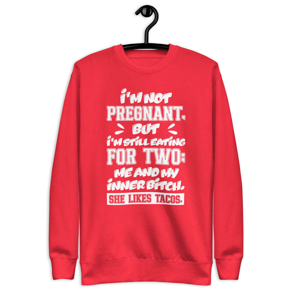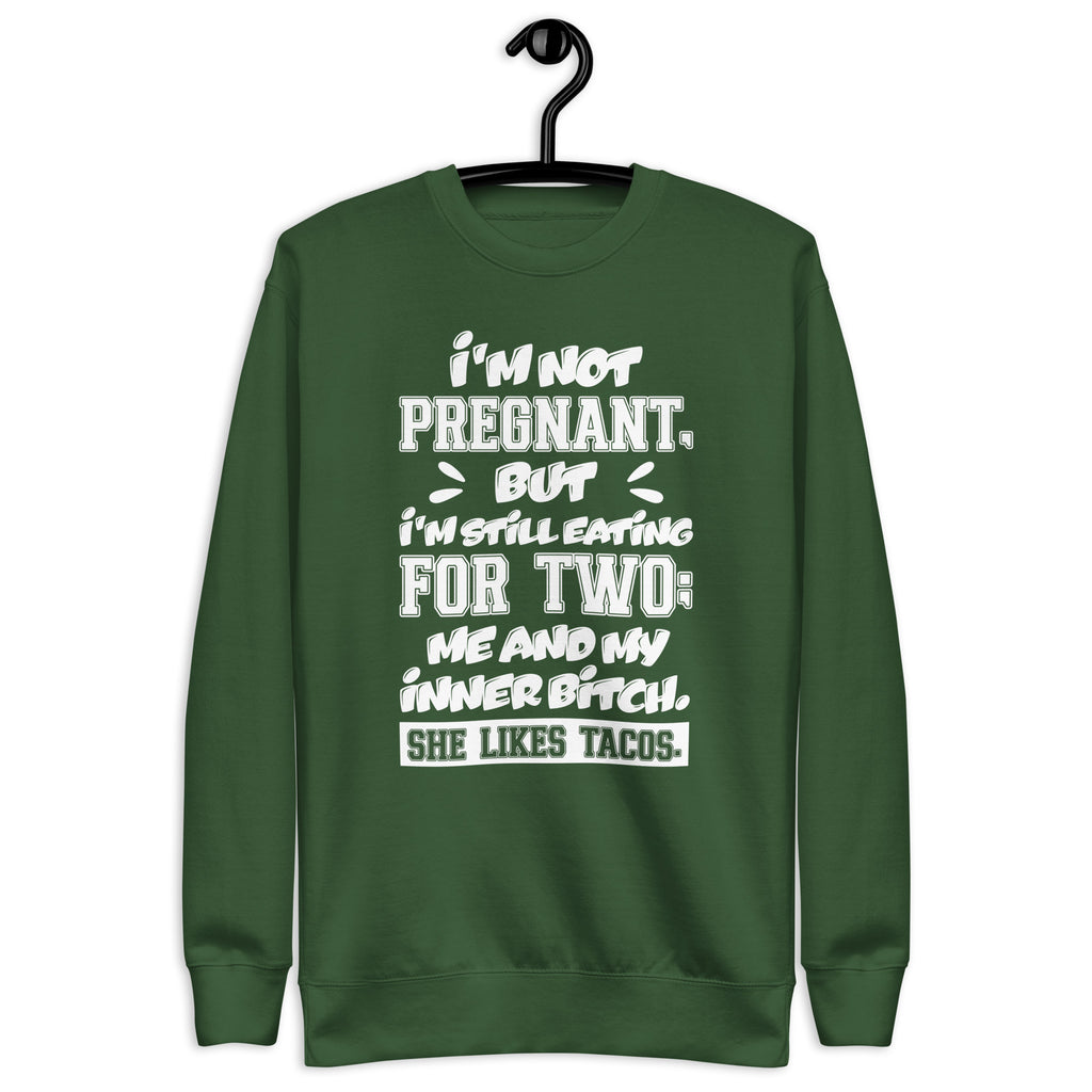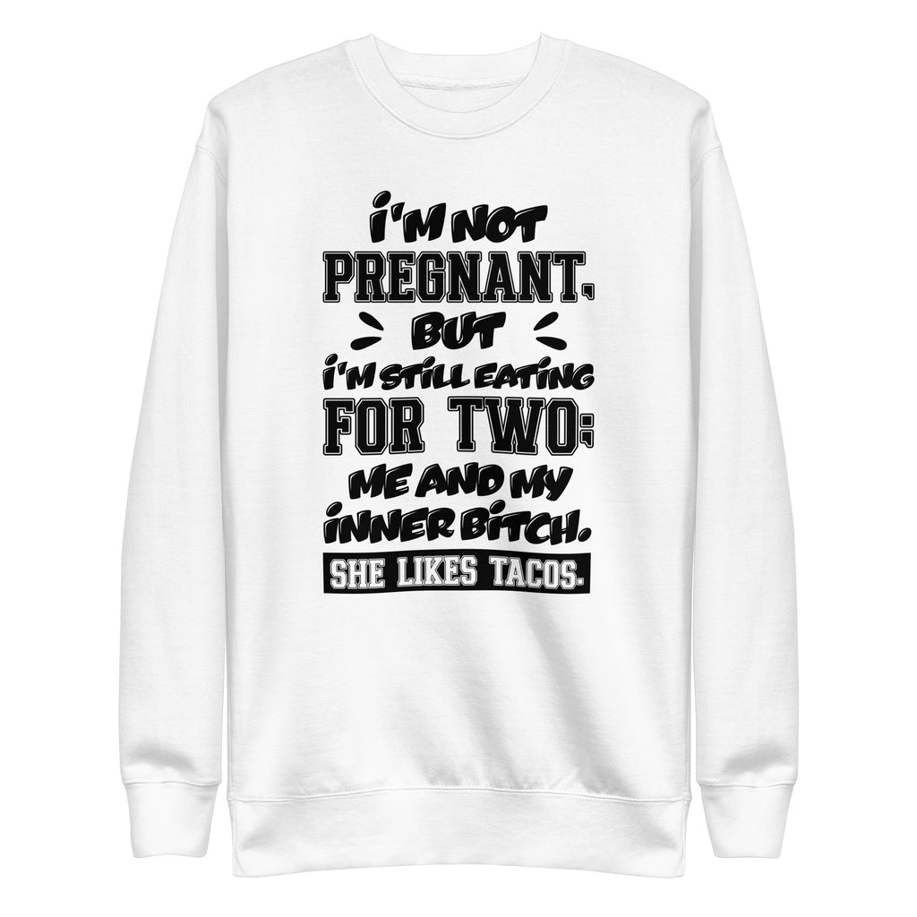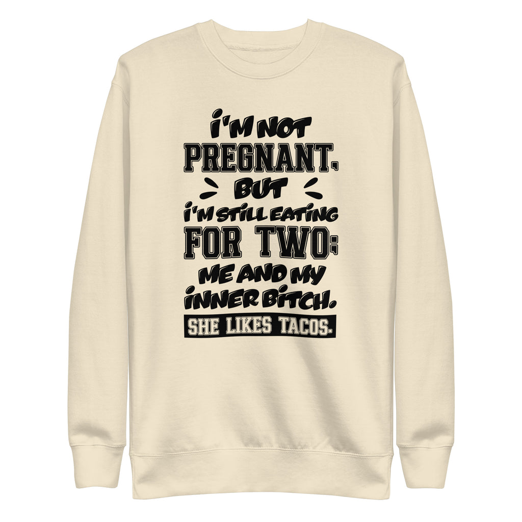 Bring some sass to your wardrobe with the “I’m Not Pregnant but I’m Still Eating for Two—Me and My Inner Bitch, She Likes Tacos” sweatshirt. Perfect for anyone who lives unapologetically, loves food (especially tacos), and isn’t afraid to speak their mind, this sweatshirt blends comfort with attitude in the best way possible.