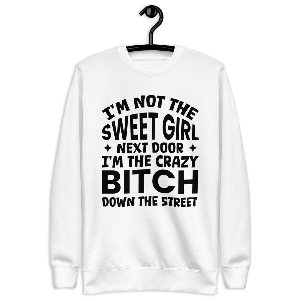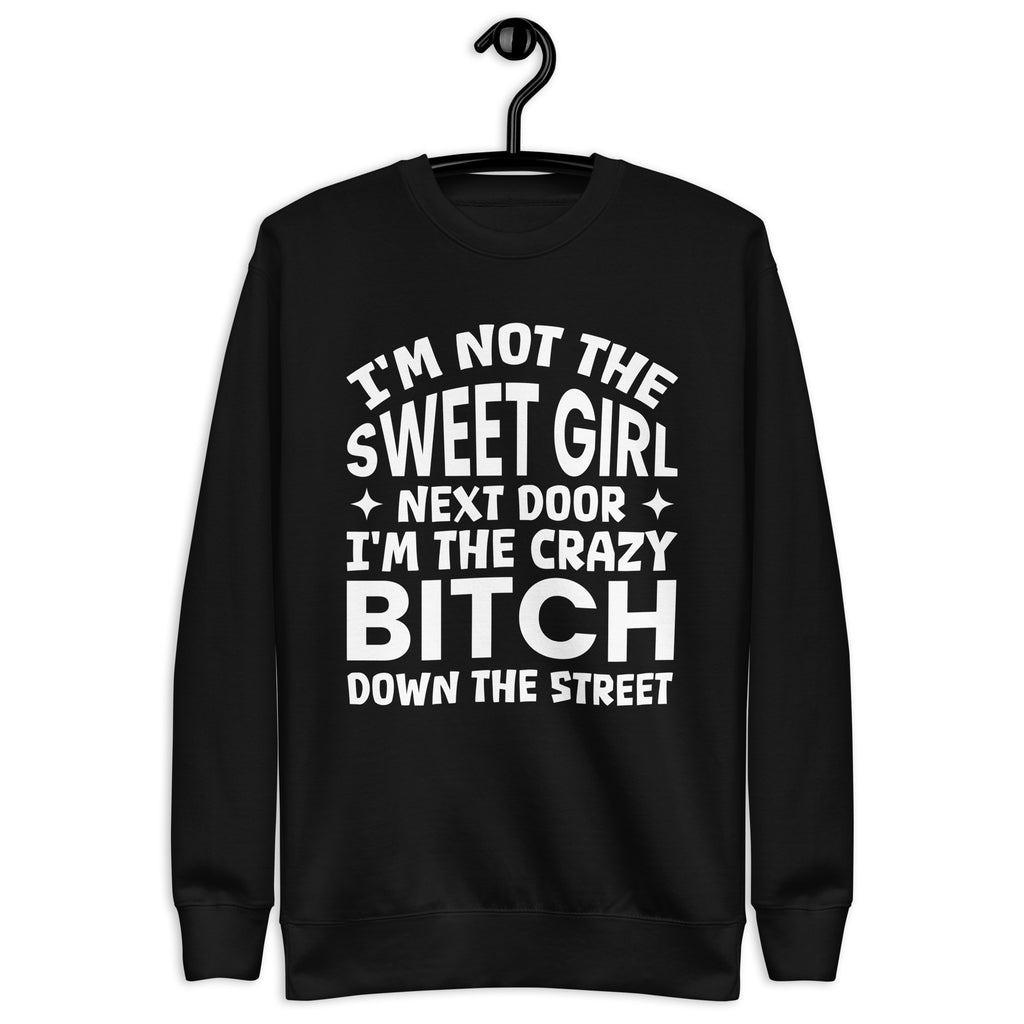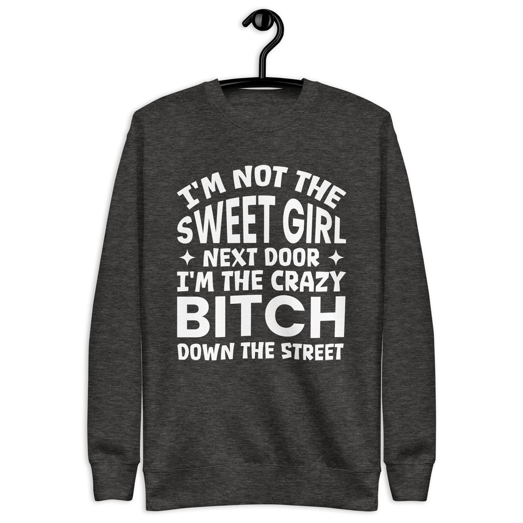 Turn up the attitude and own your wild side with this “I’m Not the Sweet Girl Next Door, I’m the Crazy Bitch Down the Street” sweatshirt. Perfect for those who don’t pretend to be nice just to fit in, this bold and funny sweatshirt lets everyone know exactly who they’re dealing with — unapologetic, confident, and a little bit chaotic.