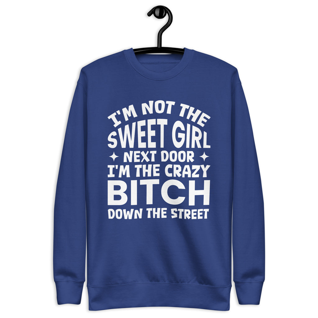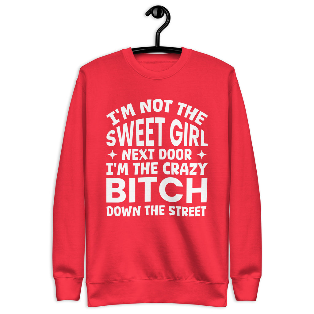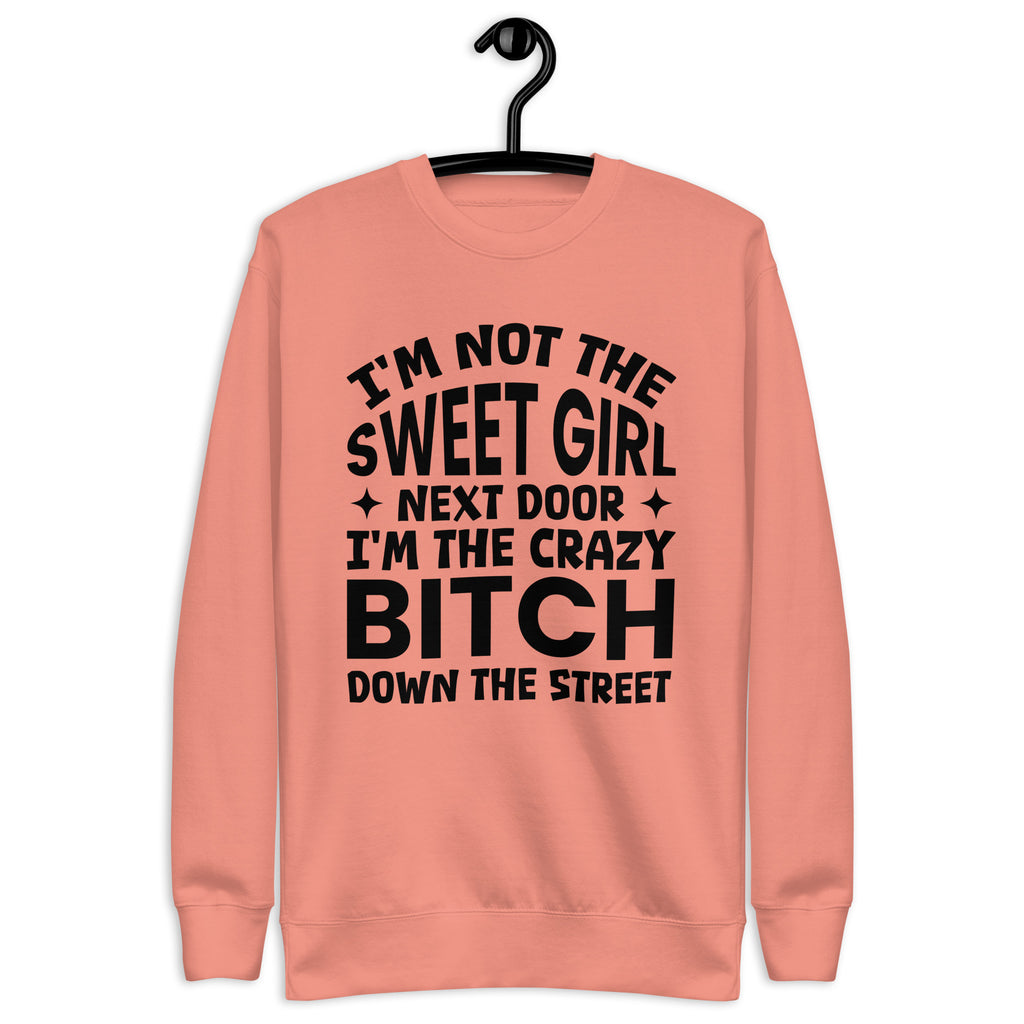 Turn up the attitude and own your wild side with this “I’m Not the Sweet Girl Next Door, I’m the Crazy Bitch Down the Street” sweatshirt. Perfect for those who don’t pretend to be nice just to fit in, this bold and funny sweatshirt lets everyone know exactly who they’re dealing with — unapologetic, confident, and a little bit chaotic.