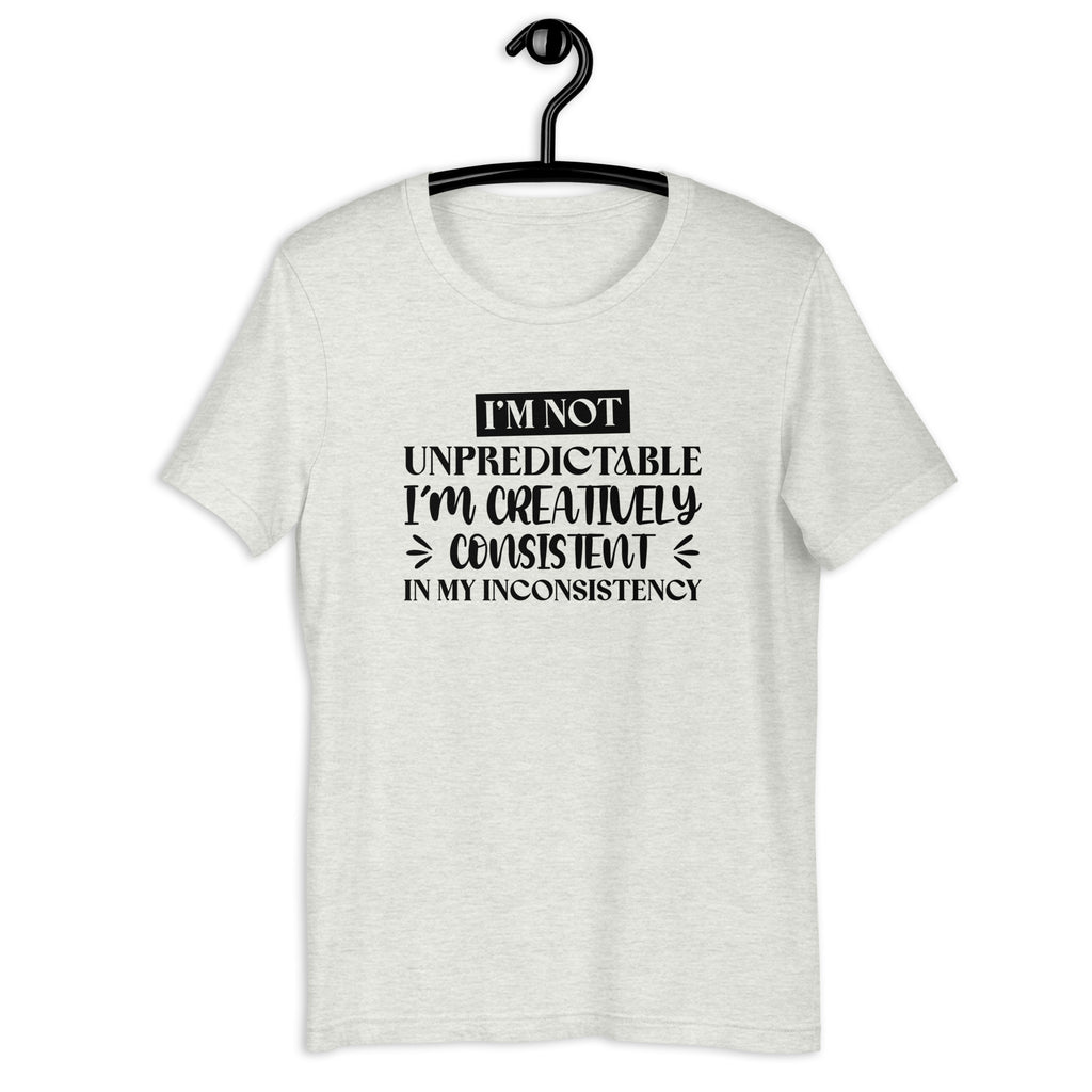 Embrace your beautiful randomness with the “I’m Not Unpredictable — I’m Creatively Consistent in My Inconsistency” T-shirt. Perfect for anyone whose vibe changes, shifts, pivots, and surprises even themselves, this tee captures the hilarious truth of being reliably unpredictable in the most artistic way possible.