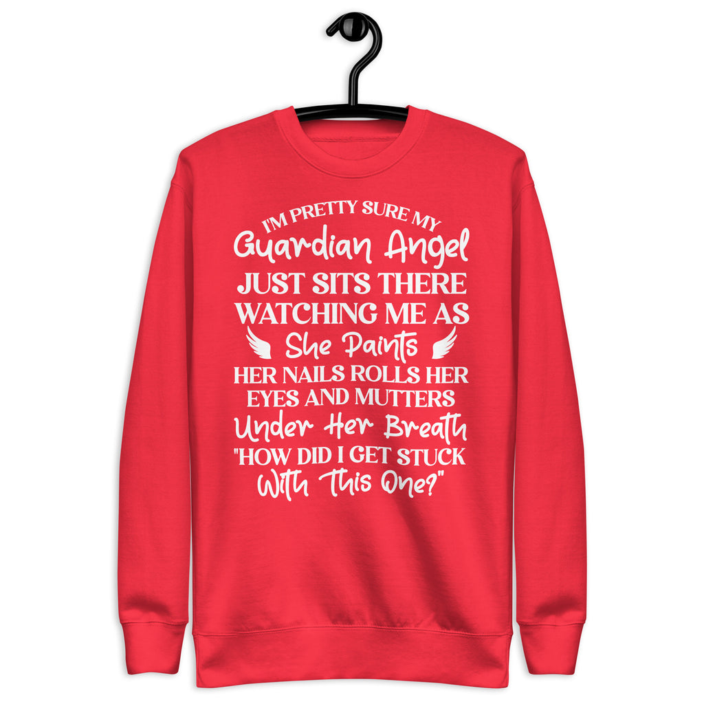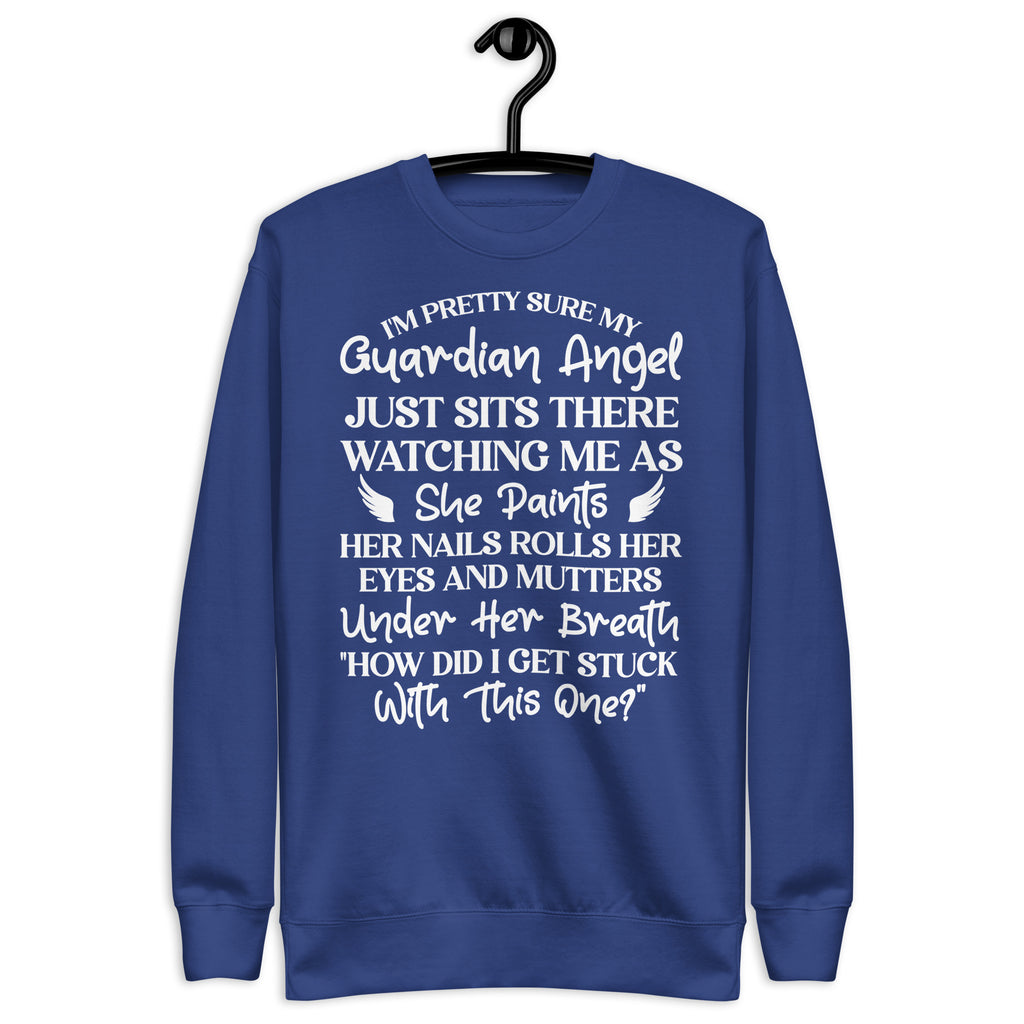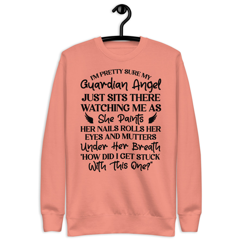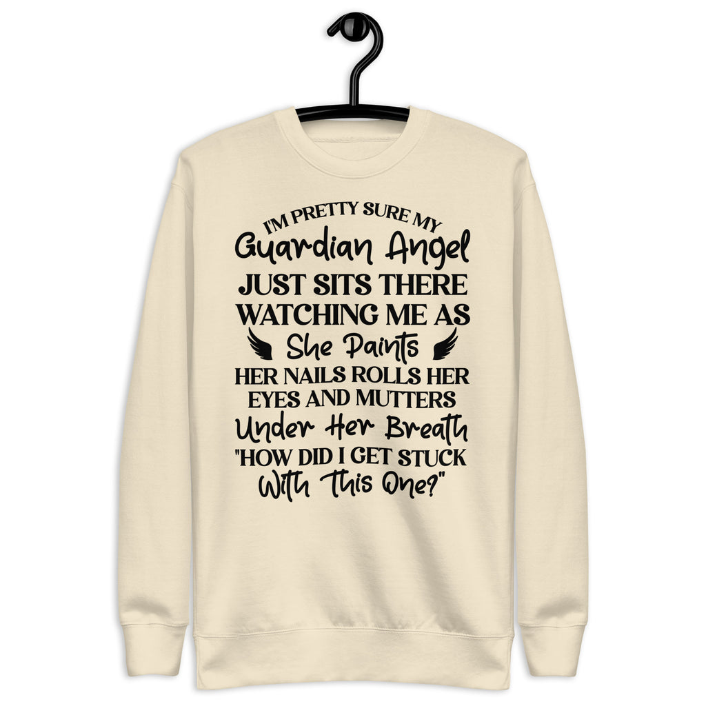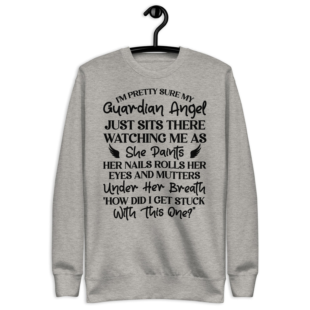 Show off your humor and personality with the “I’m Pretty Sure My Guardian Angel Just Sits There Watching Me as She Paints Her Nails, Rolls Her Eyes, and Mutters Under Her Breath ‘How Did I Get Stuck with This One’” sweatshirt. Perfect for anyone who knows they keep their guardian angel busy, this cozy piece blends sarcasm, sass, and comfort all in one.