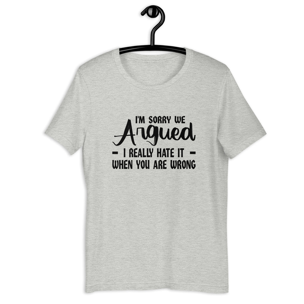 Witty, bold, and unapologetically honest. The “I’m Sorry We Argued — I Really Hate It When You Are Wrong” t-shirt is perfect for anyone who loves to speak their mind with a touch of sarcasm. It delivers humor and attitude in equal measure, making it clear who’s really right—without needing to raise your voice.