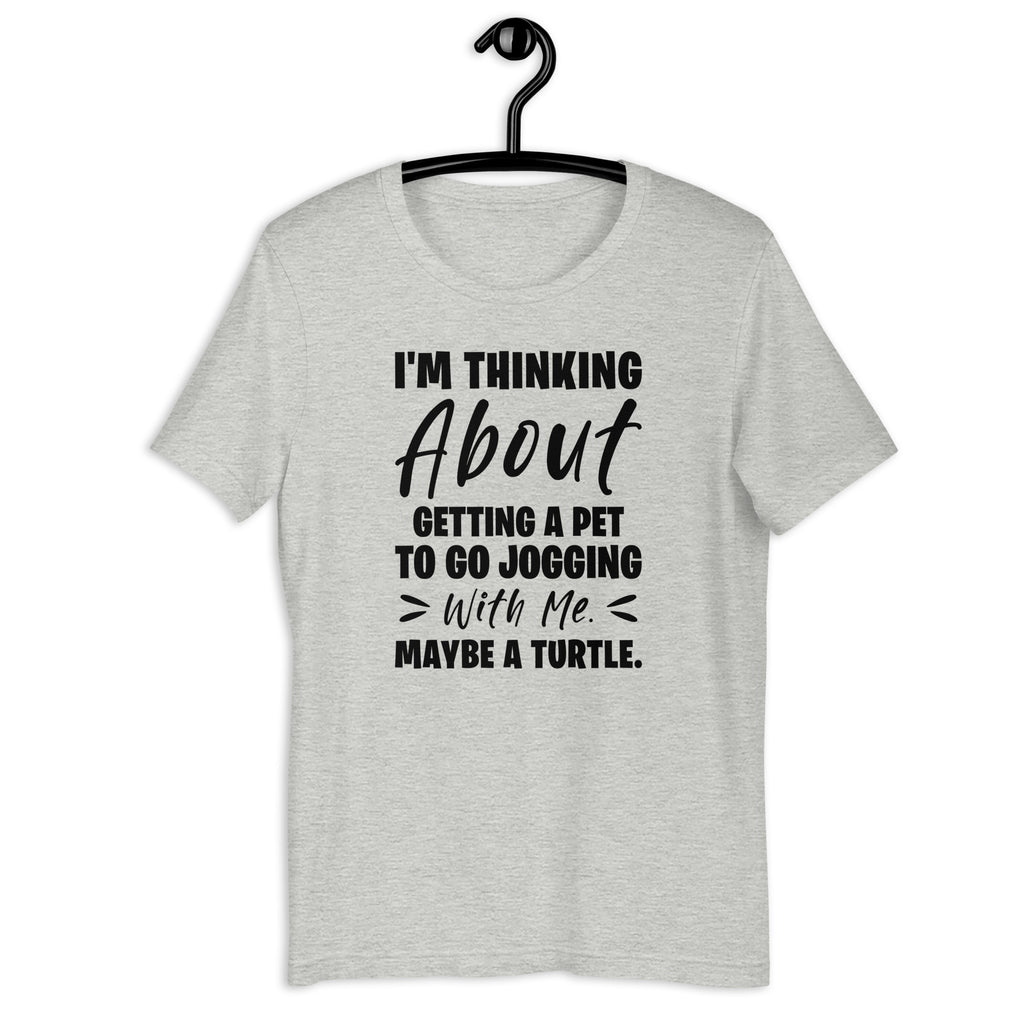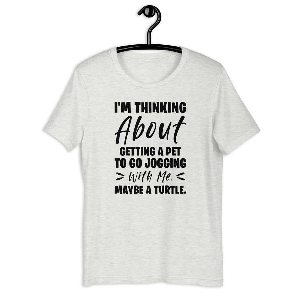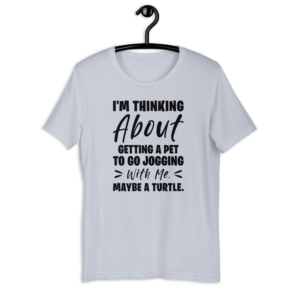Add a dose of humor to your casual style with the “I’m Thinking About Getting a Pet to Go Jogging With Me—Maybe a Turtle” t-shirt. Perfect for those who love the idea of fitness but also appreciate a good laugh, this tee celebrates slow-and-steady energy in the funniest way possible.