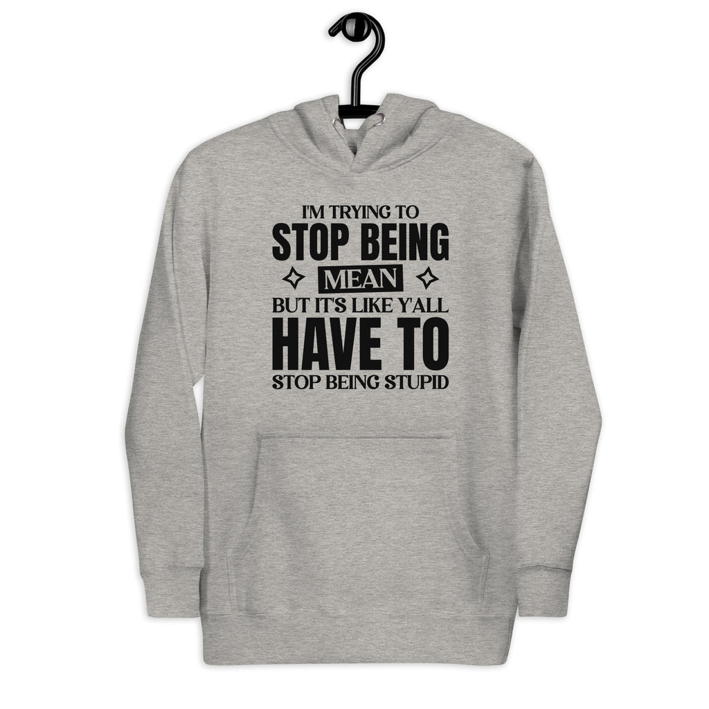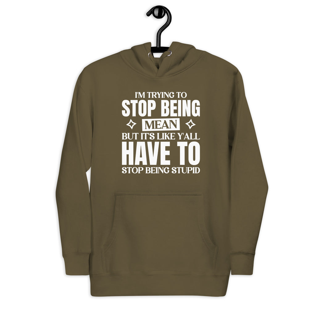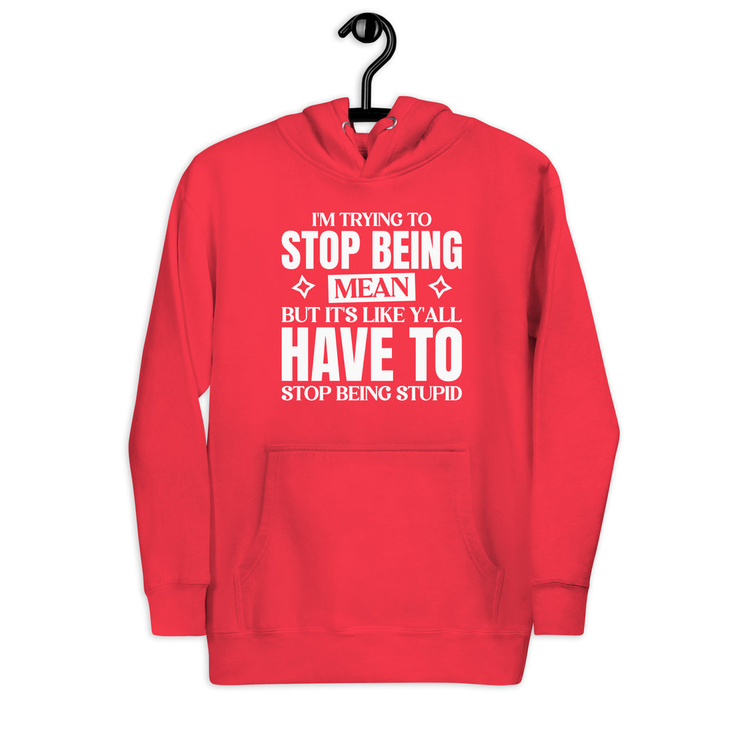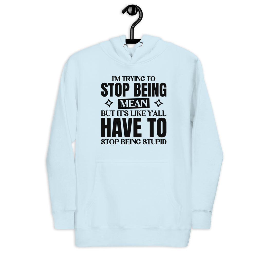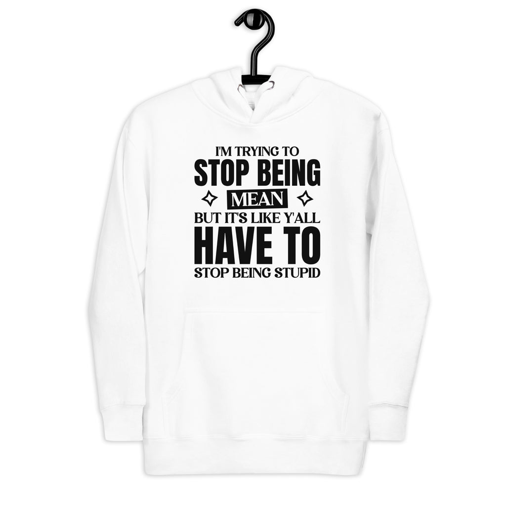 Show off your unapologetic humor with the “I’m Trying to Stop Being Mean, But It’s Like Y’all Have to Stop Being Stupid” hoodie. Perfect for those who speak fluent sarcasm, this design is a hilarious way to express your daily struggle between patience and honesty.