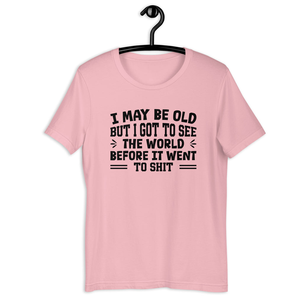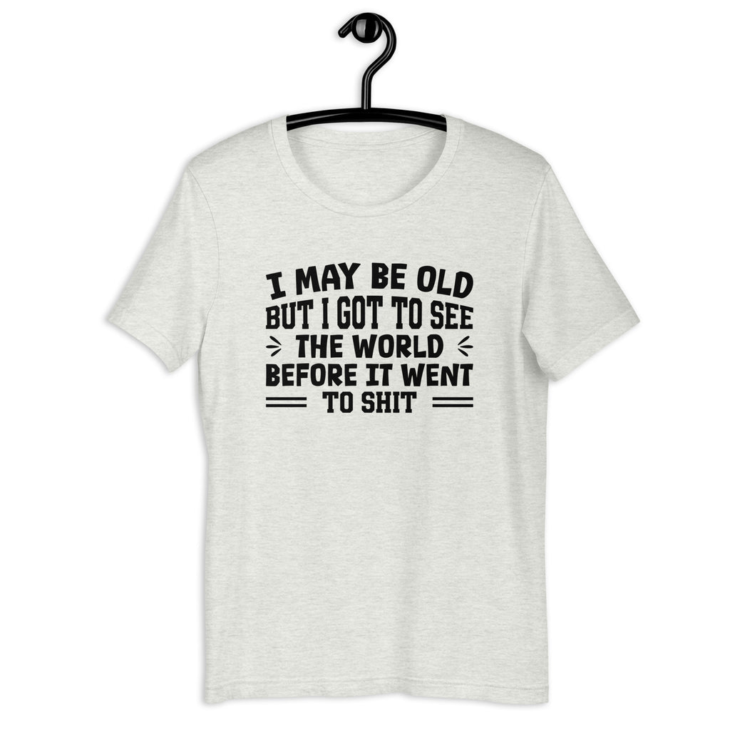 Blunt, nostalgic, and darkly humorous. The “I May Be Old, But I Got to See the World Before It Went to Sh*t” t-shirt is a sarcastic nod to lived experience and earned perspective. It’s for those who’ve been around long enough to remember when things felt simpler—and aren’t afraid to say it out loud.