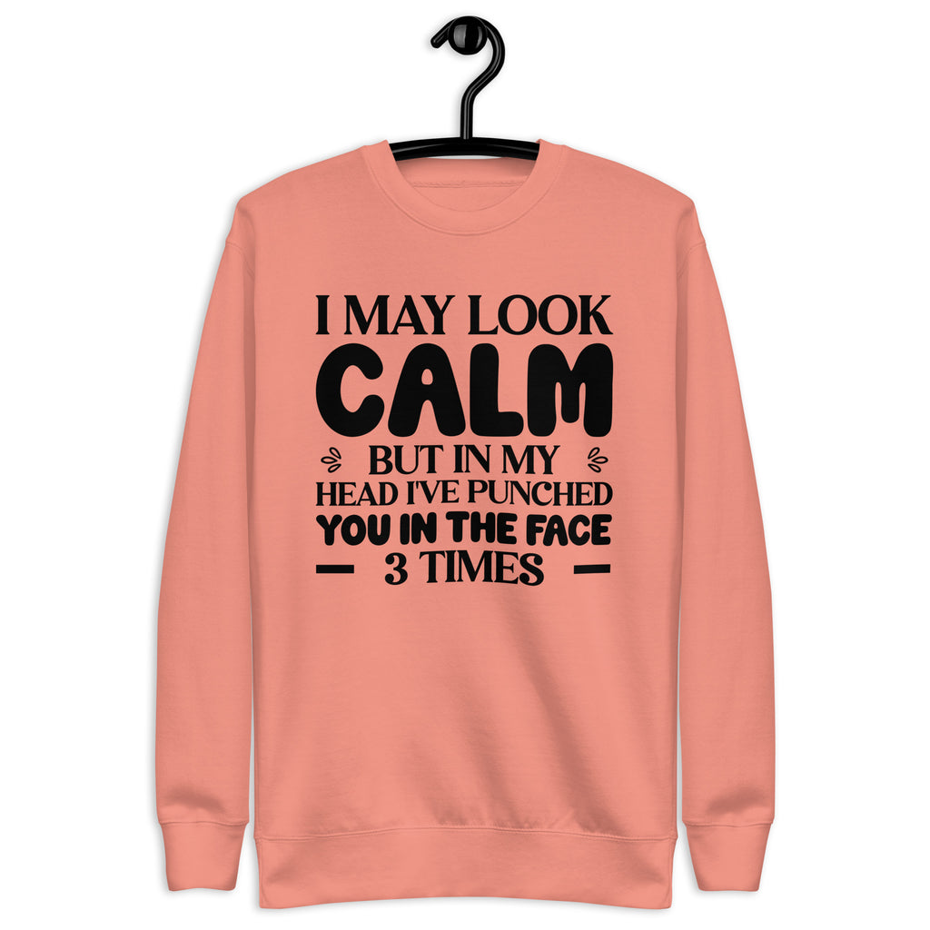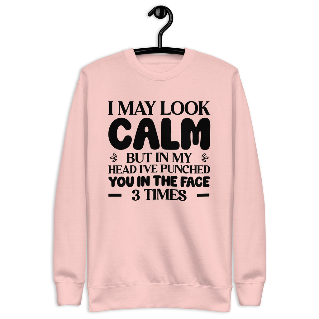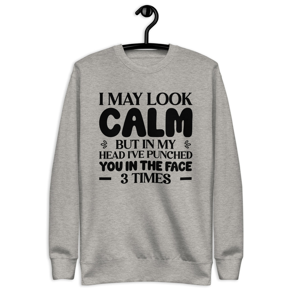 Sarcastic, relatable, and quietly unhinged. The “I May Look Calm, But in My Head I’ve Punched You in the Face 3 Times” sweatshirt perfectly captures that serene exterior hiding a very active inner monologue. It’s dry humor at its finest—polite on the outside, savage on the inside.